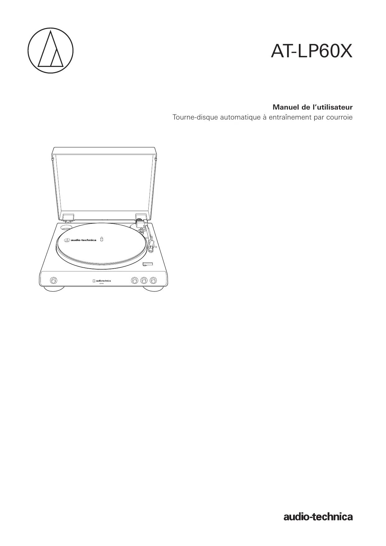 AT-LP60X Manuel de l’utilisateur Tourne-disque automatique à entraînement par courroie Introduction Nous vous remercions d’avoir fait l’acquisition de ce produit Audio-Technica. Lire attentivement ce manuel de l’utilisateur avant d’utiliser le produit pour vous assurer de bien utiliser le produit. Veuillez également conserver ce manuel pour consultations ultérieures. Ce produit peut être utilisé uniquement dans les pays où le produit est vendu. Veillez à ce que la tension d’utilisation et la fiche de l'adaptateur secteur du produit correspondent à celles utilisées dans le pays où vous vivez. Contenu de l’emballage Assurez-vous que tous les articles inclus répertoriés sur la liste ci-dessous soient présents avant d’utiliser le produit. Si certains éléments sont manquants ou endommagés, contactez votre distributeur local Audio-Technica.