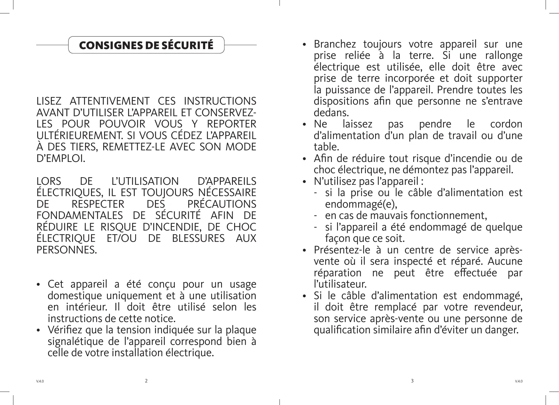 - Vérifiez que la tension indiquée sur la plaque signalétique de l’appareil correspond bien à celle de votre installation électrique. V.4.0