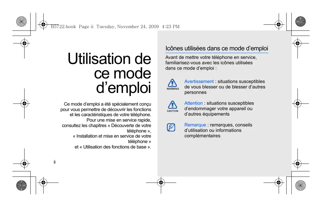 B5722.book Page ii Tuesday, November 24, 2009 4:23 PM GT-B5722 Mode d’emploi B5722.book Page ii Tuesday, November 24, 2009 4:23 PM Utilisation de ce mode d’emploi Ce mode d’emploi a été spécialement conçu pour vous permettre de découvrir les fonctions et les caractéristiques de votre téléphone. Pour une mise en service rapide, consultez les chapitres « Découverte de votre téléphone », « Installation et mise en service de votre téléphone » et « Utilisation des fonctions de base ».