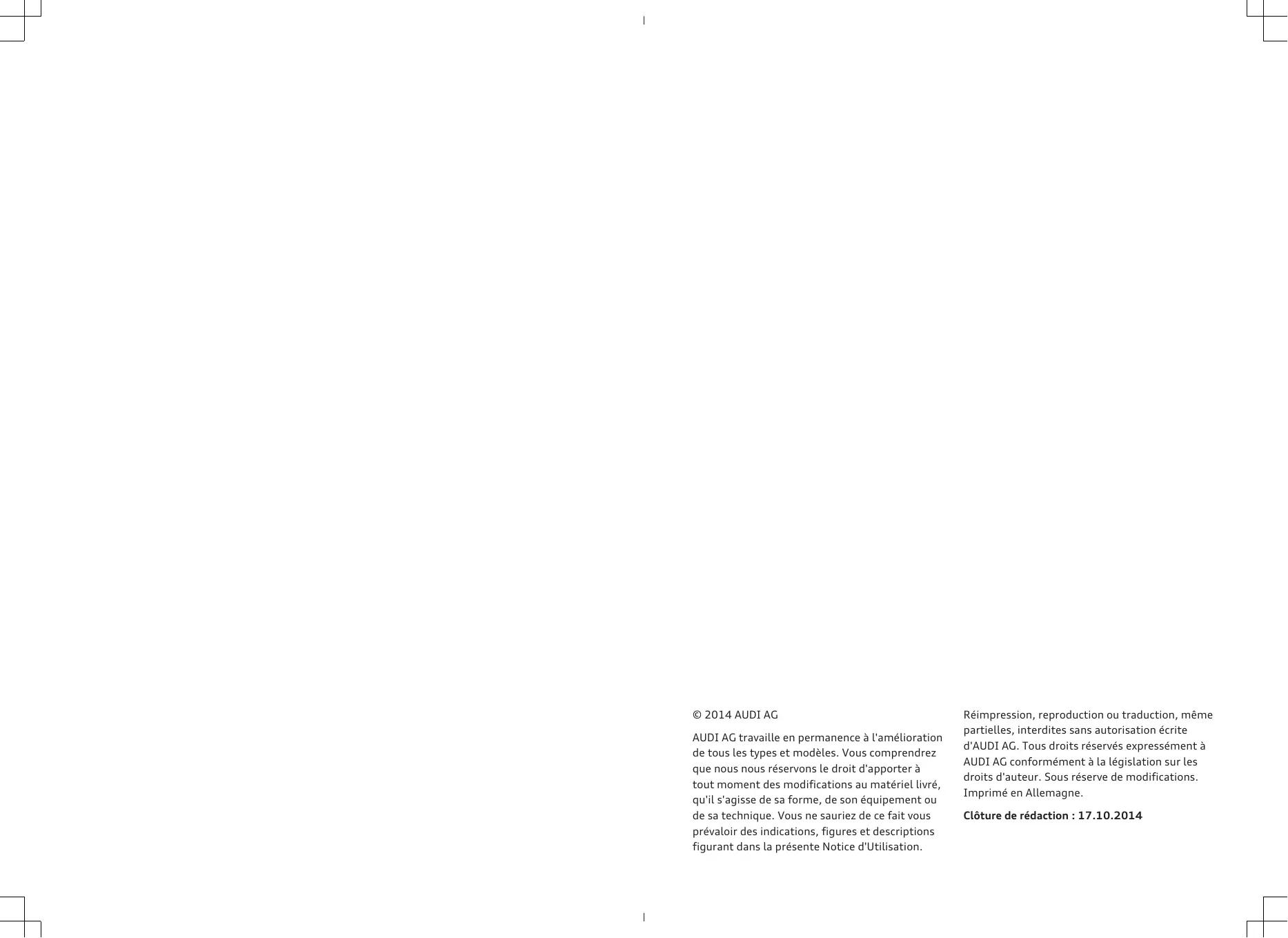152566AMH40 www.audi.com Audi Vorsprung durch Technik © 2014 AUDI AG AUDI AG travaille en permanence à l'amélioration de tous les types et modèles. Vous comprendrez que nous nous réservons le droit d'apporter à tout moment des modifications au matériel livré, qu'il s'agisse de sa forme, de son équipement ou de sa technique. Vous ne sauriez de ce fait vous prévaloir des indications, figures et descriptions figurant dans la présente Notice d'Utilisation. Réimpression, reproduction ou traduction, même partielles, interdites sans autorisation écrite d'AUDI AG. Tous droits réservés expressément à AUDI AG conformément à la législation sur les droits d'auteur. Sous réserve de modifications. Imprimé en Allemagne. Clôture de rédaction : 17.10.2014 Sommaire Introduction ...