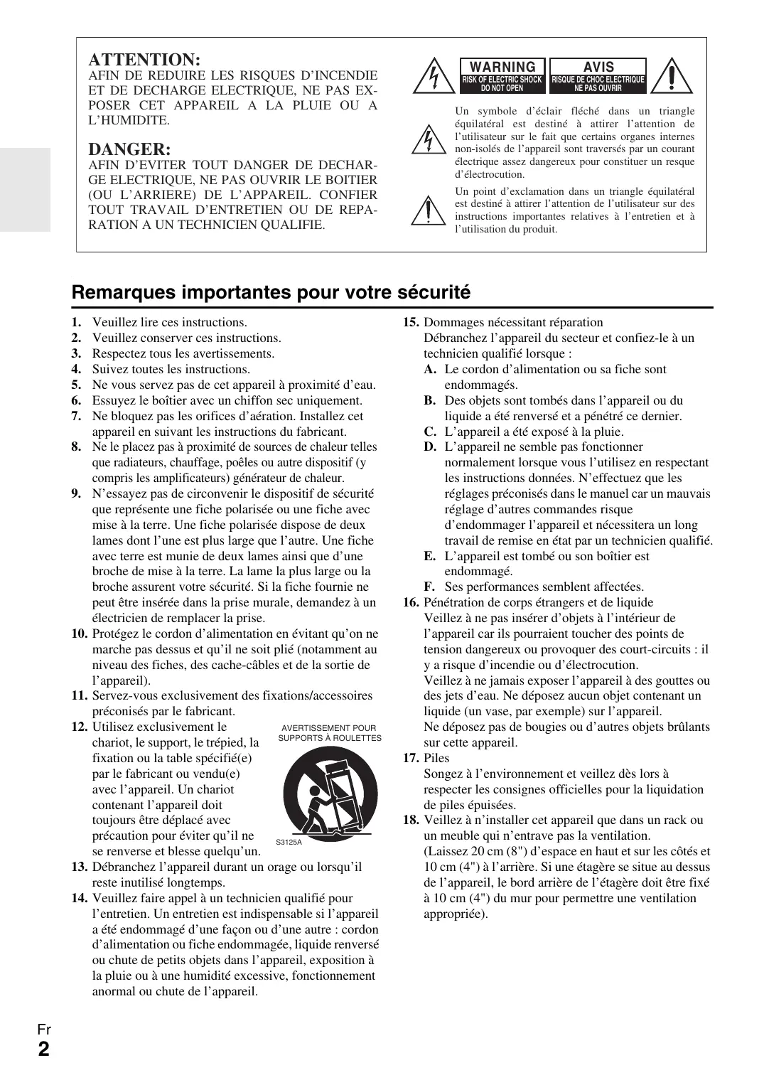 Veuillez conserver ces instructions. Respectez tous les avertissements. Suivez toutes les instructions. Ne vous servez pas de cet appareil à proximité d’eau. Essuyez le boîtier avec un chiffon sec uniquement. Ne bloquez pas les orifices d’aération. Installez cet appareil en suivant les instructions du fabricant. Ne le placez pas à proximité de sources de chaleur telles que radiateurs, chauffage, poêles ou autre dispositif (y compris les amplificateurs) générateur de chaleur. N’essayez pas de circonvenir le dispositif de sécurité que représente une fiche polarisée ou une fiche avec mise à la terre. Une fiche polarisée dispose de deux lames dont l’une est plus large que l’autre. Une fiche avec terre est munie de deux lames ainsi que d’une broche de mise à la terre. La lame la plus large ou la broche assurent votre sécurité. Si la fiche fournie ne peut être insérée dans la prise murale, demandez à un électricien de remplacer la prise. Protégez le cordon d’alimentation en évitant qu’on ne marche pas dessus et qu’il ne soit plié (notamment au niveau des fiches, des cache-câbles et de la sortie de l’appareil). Servez-vous exclusivement des fixations/accessoires préconisés par le fabricant. Utilisez exclusivement le AVERTISSEMENT POUR chariot, le support, le trépied, la SUPPORTS À ROULETTES fixation ou la table spécifié(e) par le fabricant ou vendu(e) avec l’appareil. Un chariot contenant l’appareil doit toujours être déplacé avec précaution pour éviter qu’il ne S3125A se renverse et blesse quelqu’un. Débranchez l’appareil durant un orage ou lorsqu’il reste inutilisé longtemps. Veuillez faire appel à un technicien qualifié pour l’entretien. Un entretien est indispensable si l’appareil a été endommagé d’une façon ou d’une autre : cordon d’alimentation ou fiche endommagée, liquide renversé ou chute de petits objets dans l’appareil, exposition à la pluie ou à une humidité excessive, fonctionnement anormal ou chute de l’appareil.