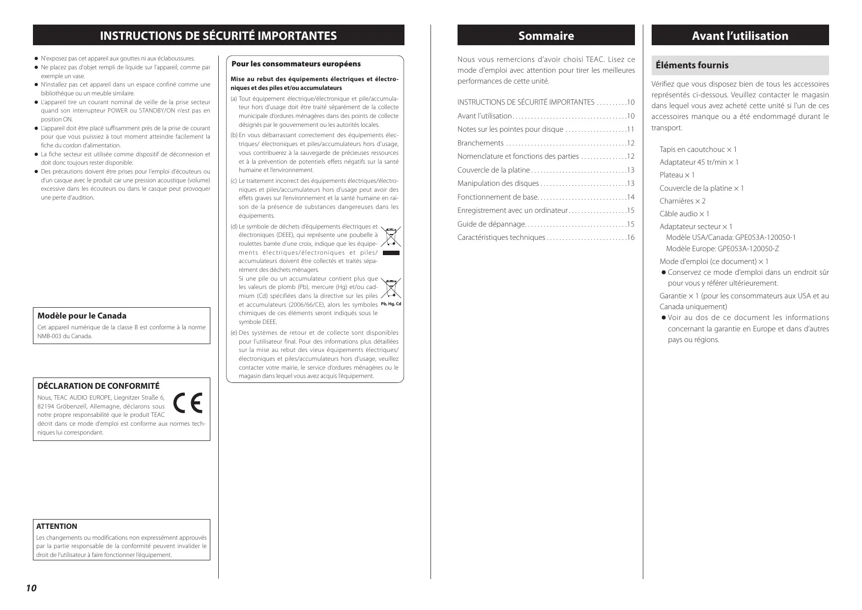 INSTRUCTIONS DE SÉCURITÉ IMPORTANTES . . . . . . . . . . 10 Avant l’utilisation . . . . . . . . . . . . . . . . . . . . . . . . . . . . . . . . . . . . 10 Notes sur les pointes pour disque . . . . . . . . . . . . . . . . . . . . 11 Branchements . . . . . . . . . . . . . . . . . . . . . . . . . . . . . . . . . . . . . . . 12 Nomenclature et fonctions des parties . . . . . . . . . . . . . . . 12 Couvercle de la platine . . . . . . . . . . . . . . . . . . . . . . . . . . . . . . 13 Manipulation des disques . . . . . . . . . . . . . . . . . . . . . . . . . . . . 13 Fonctionnement de base . . . . . . . . . . . . . . . . . . . . . . . . . . . . 14
