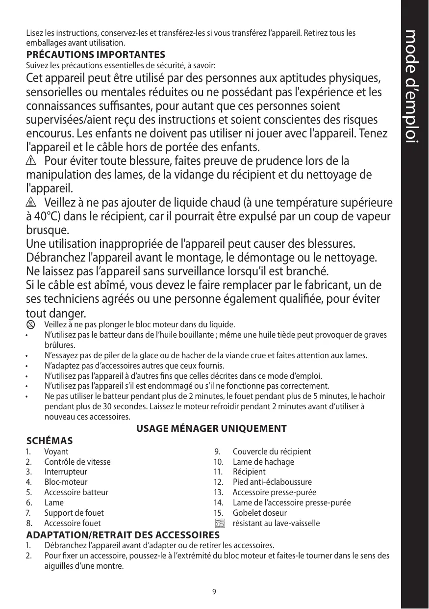 N’utilisez pas le batteur dans de l’huile bouillante ; même une huile tiède peut provoquer de graves brûlures. N’essayez pas de piler de la glace ou de hacher de la viande crue et faites attention aux lames. N’adaptez pas d’accessoires autres que ceux fournis. N’utilisez pas l’appareil à d’autres fins que celles décrites dans ce mode d’emploi. N’utilisez pas l’appareil s’il est endommagé ou s’il ne fonctionne pas correctement. Ne pas utiliser le batteur pendant plus de 2 minutes, le fouet pendant plus de 5 minutes, le hachoir pendant plus de 30 secondes. Laissez le moteur refroidir pendant 2 minutes avant d’utiliser à nouveau ces accessoires.