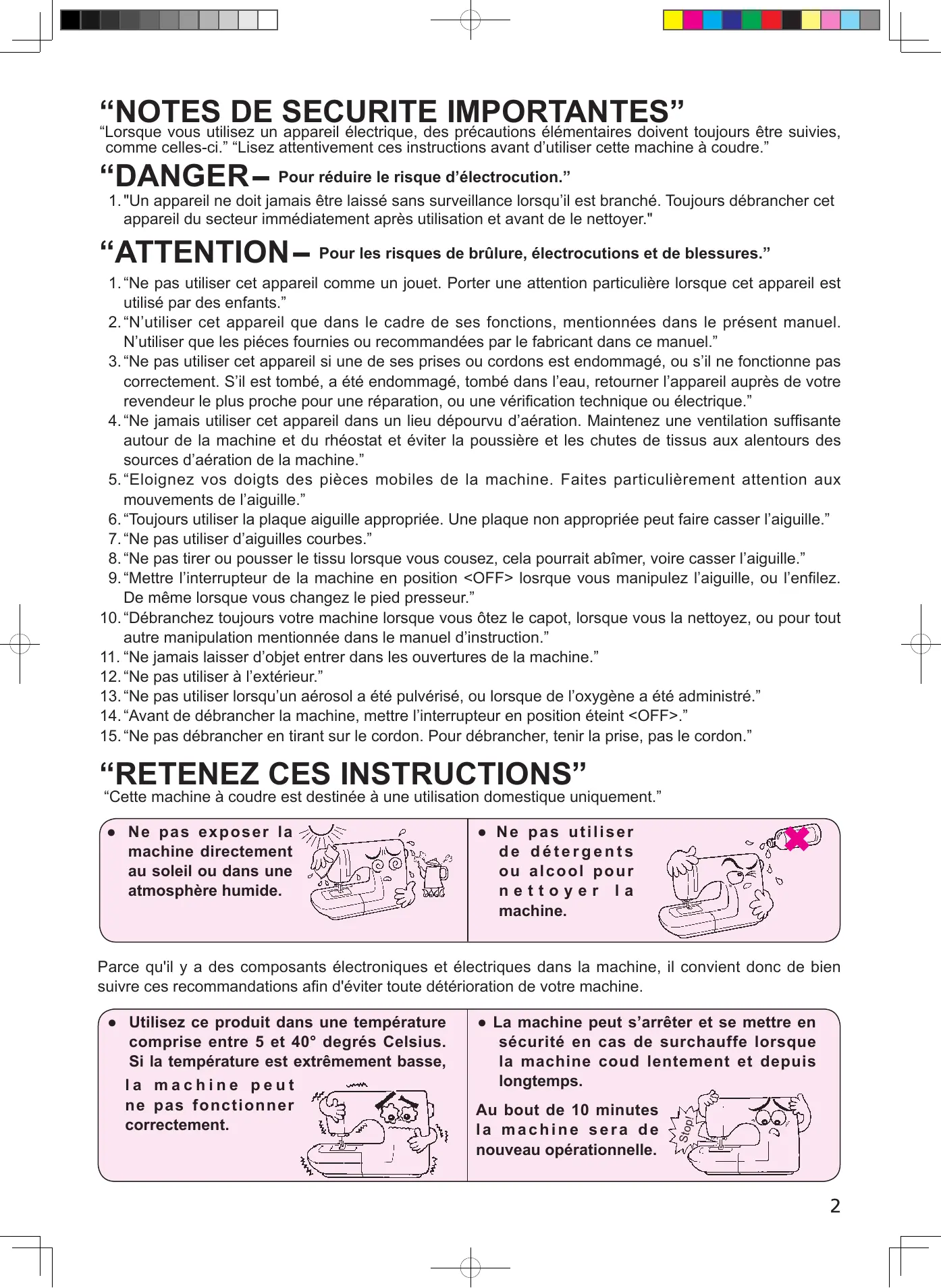 2. “N’utiliser cet appareil que dans le cadre de ses fonctions, mentionnées dans le présent manuel. N’utiliser que les piéces fournies ou recommandées par le fabricant dans ce manuel.” 3. “Ne pas utiliser cet appareil si une de ses prises ou cordons est endommagé, ou s’il ne fonctionne pas correctement. S’il est tombé, a été endommagé, tombé dans l’eau, retourner l’appareil auprès de votre revendeur le plus proche pour une réparation, ou une vérification technique ou électrique.” 4. “Ne jamais utiliser cet appareil dans un lieu dépourvu d’aération. Maintenez une ventilation suffisante autour de la machine et du rhéostat et éviter la poussière et les chutes de tissus aux alentours des sources d’aération de la machine.” 5. “Eloignez vos doigts des pièces mobiles de la machine. Faites particulièrement attention aux mouvements de l’aiguille.” 6. “Toujours utiliser la plaque aiguille appropriée. Une plaque non appropriée peut faire casser l’aiguille.” 7. “Ne pas utiliser d’aiguilles courbes.” 8. “Ne pas tirer ou pousser le tissu lorsque vous cousez, cela pourrait abîmer, voire casser l’aiguille.” 9. “Mettre l’interrupteur de la machine en position <OFF> losrque vous manipulez l’aiguille, ou l’enfilez. De même lorsque vous changez le pied presseur.” 10. “Débranchez toujours votre machine lorsque vous ôtez le capot, lorsque vous la nettoyez, ou pour tout autre manipulation mentionnée dans le manuel d’instruction.” 11. “Ne jamais laisser d’objet entrer dans les ouvertures de la machine.” 12. “Ne pas utiliser à l’extérieur.” 13. “Ne pas utiliser lorsqu’un aérosol a été pulvérisé, ou lorsque de l’oxygène a été administré.” 14. “Avant de débrancher la machine, mettre l’interrupteur en position éteint <OFF>.” 15. “Ne pas débrancher en tirant sur le cordon. Pour débrancher, tenir la prise, pas le cordon.”