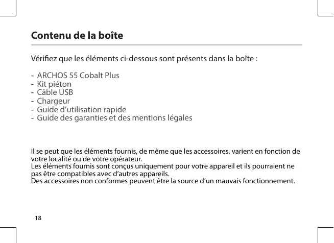 Contenu de la boîte Vérifiez que les éléments ci-dessous sont présents dans la boîte : -- ARCHOS 55 Cobalt Plus -- Kit piéton -- Câble USB -- Chargeur -- Guide d’utilisation rapide -- Guide des garanties et des mentions légales Il se peut que les éléments fournis, de même que les accessoires, varient en fonction de votre localité ou de votre opérateur. Les éléments fournis sont conçus uniquement pour votre appareil et ils pourraient ne pas être compatibles avec d’autres appareils. Des accessoires non conformes peuvent être la source d’un mauvais fonctionnement.