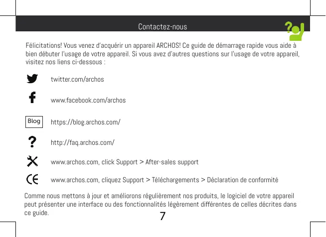 https://blog.archos.com/ http://faq.archos.com/ www.archos.com, click Support > After-sales support www.archos.com, cliquez Support > Téléchargements > Déclaration de conformité
