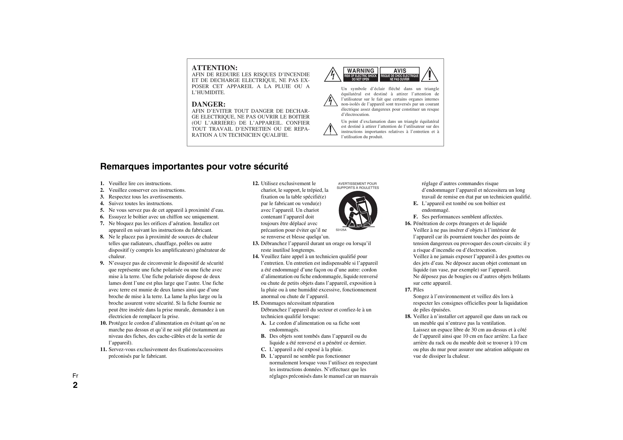 12. Utilisez exclusivement le SUPPORTS À ROULETTES chariot, le support, le trépied, la fixation ou la table spécifié(e) par le fabricant ou vendu(e) avec l’appareil. Un chariot contenant l’appareil doit toujours être déplacé avec S3125A précaution pour éviter qu’il ne se renverse et blesse quelqu’un. 13. Débranchez l’appareil durant un orage ou lorsqu’il reste inutilisé longtemps. 14. Veuillez faire appel à un technicien qualifié pour l’entretien. Un entretien est indispensable si l’appareil a été endommagé d’une façon ou d’une autre: cordon d’alimentation ou fiche endommagée, liquide renversé ou chute de petits objets dans l’appareil, exposition à la pluie ou à une humidité excessive, fonctionnement anormal ou chute de l’appareil. 15. Dommages nécessitant réparation Débranchez l’appareil du secteur et confiez-le à un technicien qualifié lorsque: A. Le cordon d’alimentation ou sa fiche sont endommagés. B. Des objets sont tombés dans l’appareil ou du liquide a été renversé et a pénétré ce dernier. C. L’appareil a été exposé à la pluie. D. L’appareil ne semble pas fonctionner normalement lorsque vous l’utilisez en respectant les instructions données. N’effectuez que les réglages préconisés dans le manuel car un mauvais