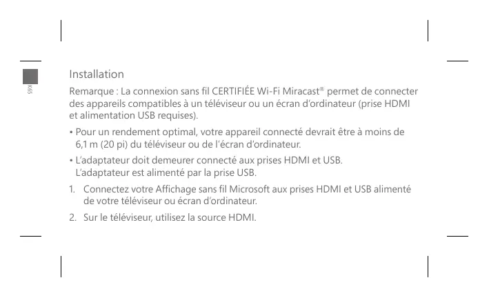 Remarque : La connexion sans fil CERTIFIÉE Wi-Fi Miracast® permet de connecter des appareils compatibles à un téléviseur ou un écran d’ordinateur (prise HDMI et alimentation USB requises). • Pour un rendement optimal, votre appareil connecté devrait être à moins de 6,1 m (20 pi) du téléviseur ou de l’écran d’ordinateur. • L’adaptateur doit demeurer connecté aux prises HDMI et USB. L’adaptateur est alimenté par la prise USB. 1. Connectez votre Affichage sans fil Microsoft aux prises HDMI et USB alimenté de votre téléviseur ou écran d’ordinateur. 2. Sur le téléviseur, utilisez la source HDMI.