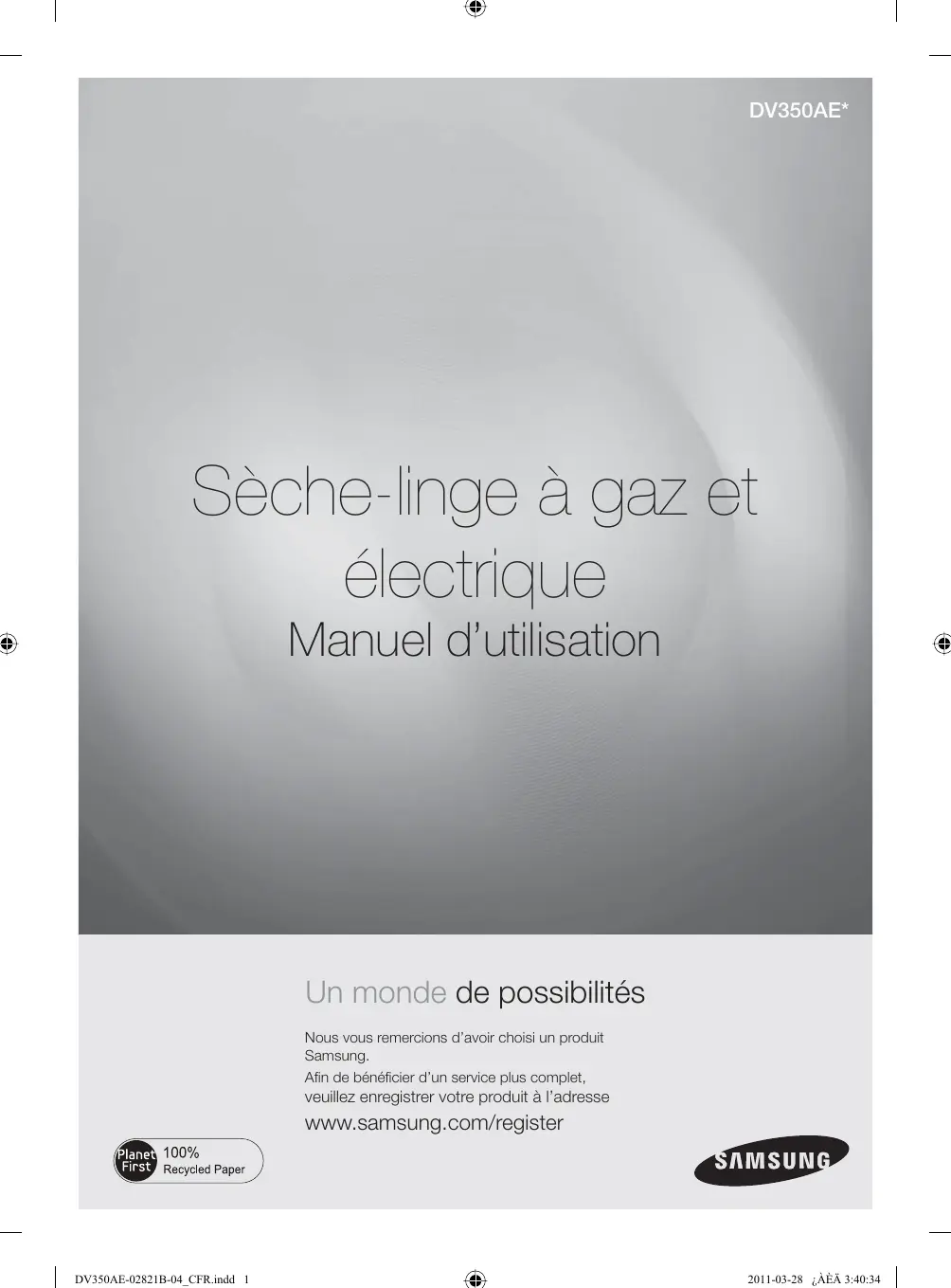 CANADA 1-800-SAMSUNG(726-7864) www.samsung.com Code No. DC68-02821B-04_EN DV350AE-02821B-04_EN.indd Sec10:38 2011-03-28 ¿ÀÈÄ 3:42:12 DV350AE* Sèche-linge à gaz et électrique Manuel d’utilisation Un monde de possibilités Nous vous remercions d’avoir choisi un produit Samsung. Afin de bénéficier d’un service plus complet, veuillez enregistrer votre produit à l’adresse www.samsung.com/register DV350AE-02821B-04_CFR.indd 1 2011-03-28 ¿ÀÈÄ 3:40:34 caractéristiques
