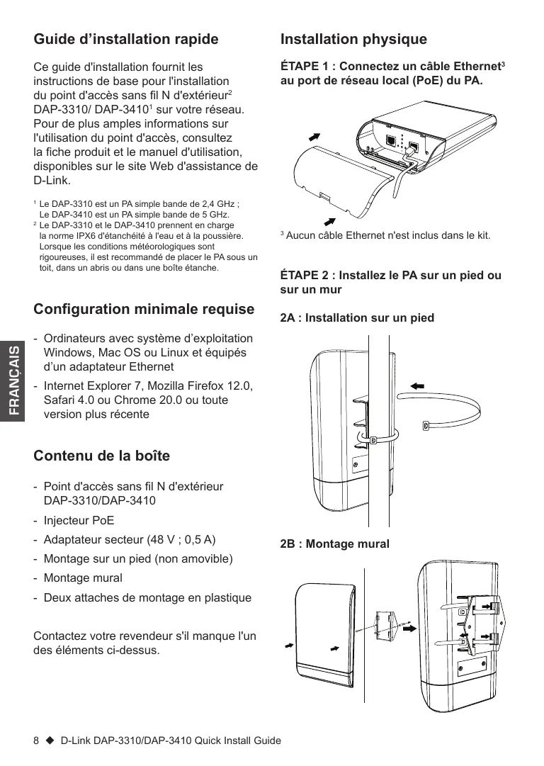 Le DAP-3310 est un PA simple bande de 2,4 GHz ; Le DAP-3410 est un PA simple bande de 5 GHz. Le DAP-3310 et le DAP-3410 prennent en charge la norme IPX6 d'étanchéité à l'eau et à la poussière. Lorsque les conditions météorologiques sont rigoureuses, il est recommandé de placer le PA sous un toit, dans un abris ou dans une boîte étanche. FRANÇAIS Aucun câble Ethernet n'est inclus dans le kit. ÉTAPE 2 : Installez le PA sur un pied ou sur un mur 2A : Installation sur un pied -- Ordinateurs avec système d’exploitation Windows, Mac OS ou Linux et équipés d’un adaptateur Ethernet -- Internet Explorer 7, Mozilla Firefox 12.0, Safari 4.0 ou Chrome 20.0 ou toute version plus récente Contenu de la boîte -- Point d'accès sans fil N d'extérieur DAP-3310/DAP-3410 -- Injecteur PoE -- Adaptateur secteur (48 V ; 0,5 A) -- Montage sur un pied (non amovible) 2B : Montage mural -- Montage mural -- Deux attaches de montage en plastique Contactez votre revendeur s'il manque l'un des éléments ci-dessus. ÉTAPE 3 : Connectez le fil de mise à la terre. Configuration Il est recommandé d'utiliser un fil de mise à la terre4 pour protéger votre périphérique contre les foudroiements et la formation d'électricité statique. Si vous configurez le PA localement, connectez un PC au port DATA IN de l'injecteur PoE à l'aide d'un câble Ethernet.