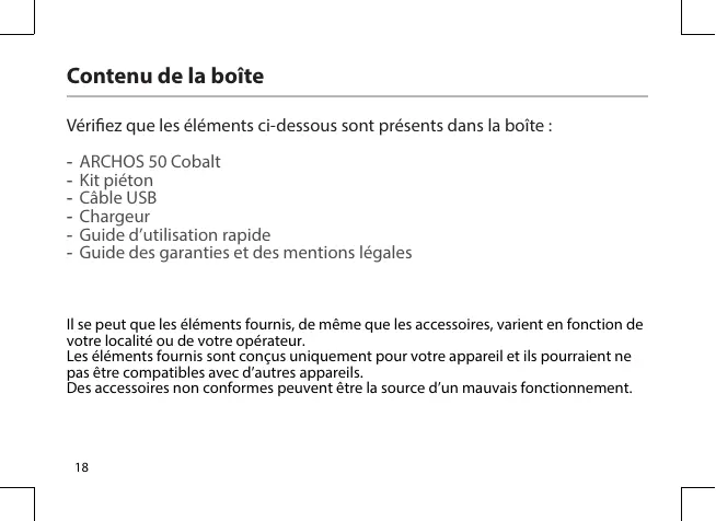 Contenu de la boîte Vérifiez que les éléments ci-dessous sont présents dans la boîte : -- ARCHOS 50 Cobalt -- Kit piéton -- Câble USB -- Chargeur -- Guide d’utilisation rapide -- Guide des garanties et des mentions légales
