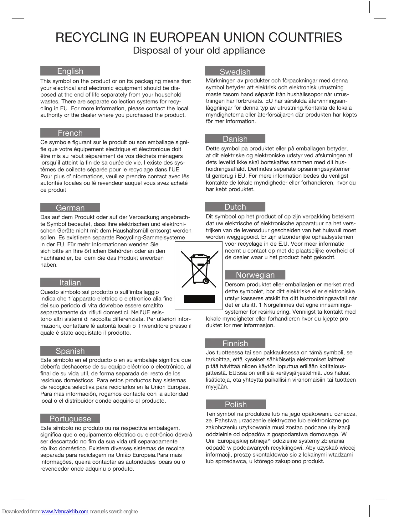 Si vous quittez votre domicile pour une longue pèriode, nous vous conseillons de débrancher votre appareil. PÉNÉTRATION D’OBJETS OU DE LIQUIDE Des précautions doivent être prises afin d’empécher la pénétration d’objets ou de liquide à l’intérieur de votre appareil. SERVICE Votre appareil doit être impérativement dépanné par du personnel compétent et qualifié. Afin de connaitre la station technique la plus proche, merci de contacter votre distributeur national. Downloaded from www.Manualslib.com manuals search engine