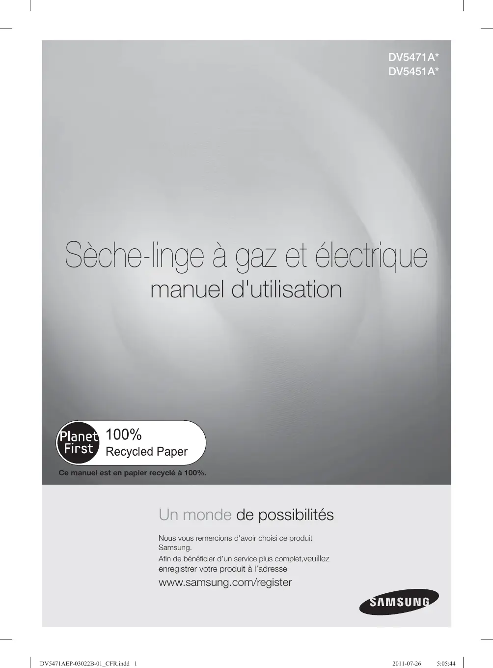 CANADA 1-800-SAMSUNG(726-7864) www.samsung.com Code No. DC68-03022B-01_EN DV5471AEP-03022B-01_EN.indd Sec7:40 2011-07-22 8:37:39 DV5471A* DV5451A* Sèche-linge à gaz et électrique manuel d'utilisation Ce manuel est en papier recyclé à 100%. Un monde de possibilités Nous vous remercions d'avoir choisi ce produit Samsung. Afin de bénéficier d’un service plus complet,veuillez enregistrer votre produit à l’adresse www.samsung.com/register DV5471AEP-03022B-01_CFR.indd 1 2011-07-26 5:05:44 caractéristiques