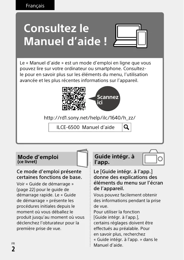 Consultez le « Manuel d’aide » pour obtenir des instructions détaillées au sujet des nombreuses fonctions de l’appareil. http://rd1.sony.net/help/ilc/1640/h_zz/