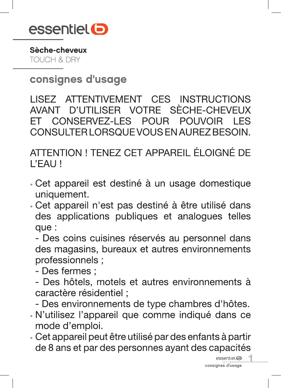 ESC - ESC3 TOUCH & DRY - Sèche cheveux ESSENTIELB - Notice d'utilisation et mode d'emploi gratuit