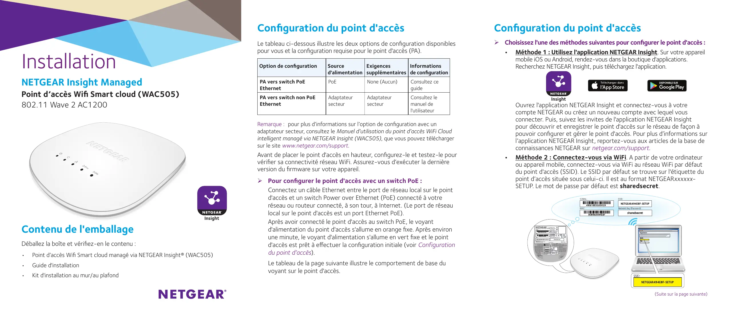 - Méthode 1 : Utilisez l'application NETGEAR Insight. Sur votre appareil mobile iOS ou Android, rendez-vous dans la boutique d'applications. Recherchez NETGEAR Insight, puis téléchargez l'application. Option de configuration Source Exigences Informations d'alimentation supplémentaires de configuration PA vers switch PoE Ethernet PoE None (Aucun) Consultez ce guide PA vers switch non PoE Ethernet Adaptateur secteur Adaptateur secteur Consultez le manuel de l'utilisateur Insight Remarque : pour plus d’informations sur l’option de configuration avec un adaptateur secteur, consultez le Manuel d’utilisation du point d’accès WiFi Cloud intelligent managé via NETGEAR Insight (WAC505), que vous pouvez télécharger sur le site www.netgear.com/support. Avant de placer le point d'accès en hauteur, configurez-le et testez-le pour vérifier sa connectivité réseau WiFi. Assurez-vous d’exécuter la dernière version du firmware sur votre appareil. Insight Contenu de l'emballage Déballez la boîte et vérifiez-en le contenu :