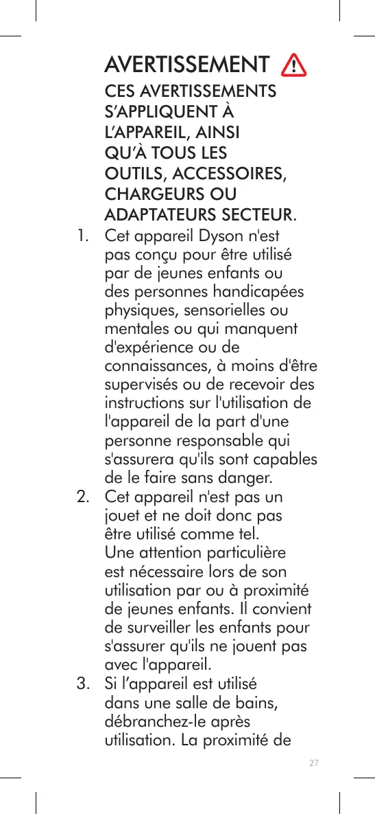 • Ne pas effectuer de travaux d’entretien ou de réparation autres que ceux indiqués dans ce manuel Dyson, ou que ceux conseillés par le Service Consommateurs Dyson.