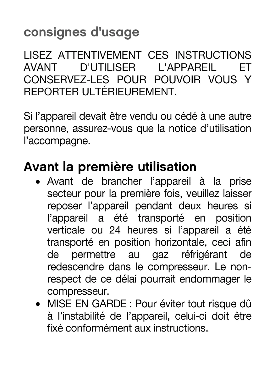 | Consignes de sécurité | Respecter délai de repos et fixation |