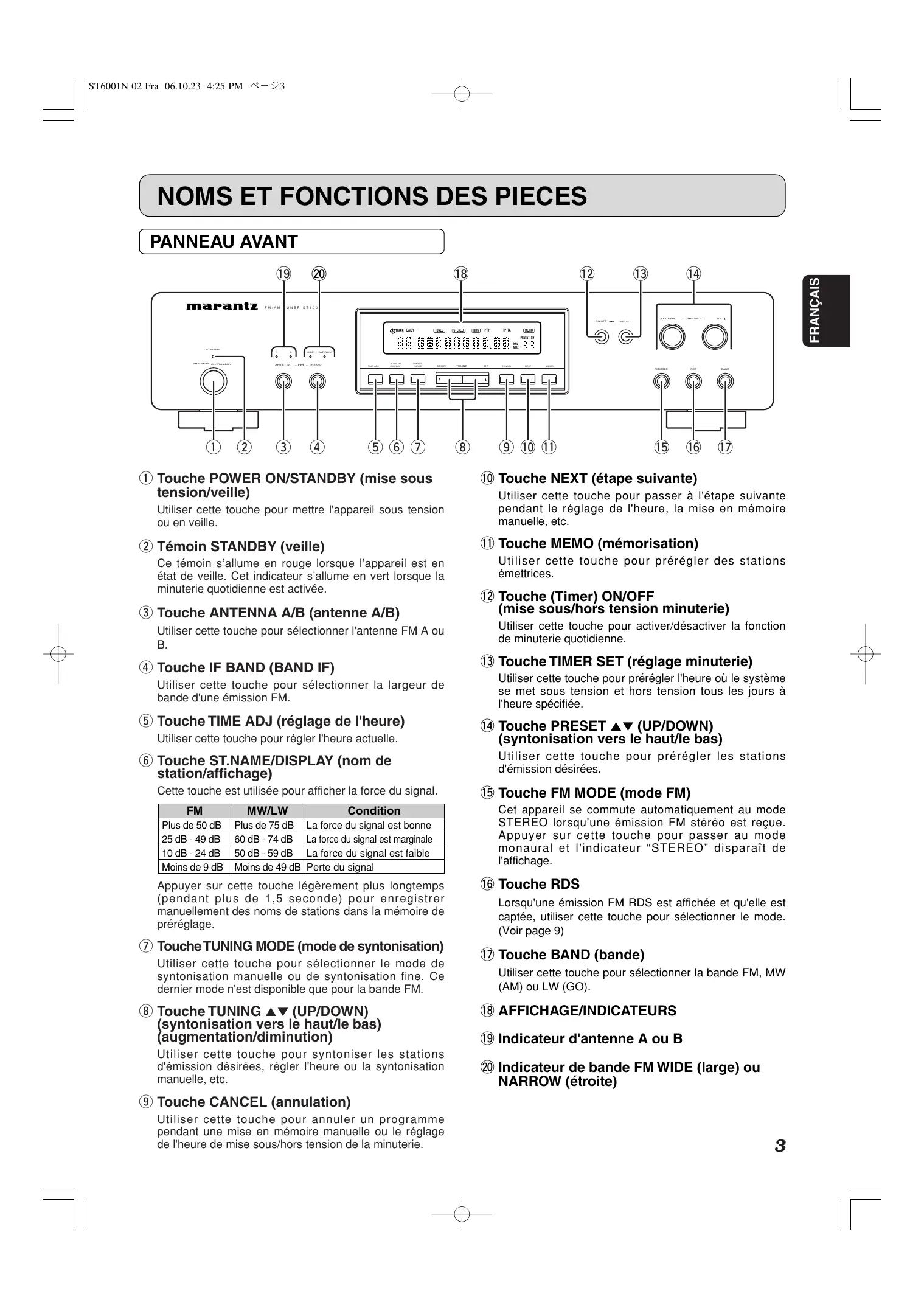 Appuyez légèrement une ou deux fois, sur la touche RESET à l’aide d’un crayon ou d’un stylo. 7 Entretien et maintenance Ce chapitre traite des opérations d’entretien et de maintenance à effectuer afin que l’utilisation de votre appareil Marantz soit optimale. 7 Nettoyage des surfaces exterieures La finition extérieure de votre ST6001 durera indéfiniment tant que vous l’entretiendrez correctement. Ne jamais utiliser des tampons à récurer, de la paille de fer, des poudres à récurer ou de puissants agents chimiques (comme des produits de lessive), de l’alcool, des diluants, de la benzine, des insecticides ou autres substances volatiles étant donné qu’elles altèrent la finition de l’appareil. De la même manière, ne jamais utiliser de chiffons imbibés de substances chimiques. Si l’appareil est sale, nettoyer les surfaces extérieures avec un chiffon doux, non pelucheux. Seuls des techniciens qualifiés et compétents sont autorisés à réparer votre appareil. Marantz et son personnel formé en usine présent dans les centres de garantie, disposent des connaissances et des équipements spéciaux requis pour la réparation et l’étalonnage de ces appareils de précision. En cas de problème, appelez le numéro vert figurant sur la garantie afin de connaître le nom et l’adresse du Centre autorisé de service aprèsvente Marantz le plus proche de chez vous. Très souvent, le revendeur auprès duquel vous avez acquis votre appareil Marantz sera équipé pour effectuer la réparation. Veuillez préciser le modèle et le numéro de série de votre appareil et joindre une copie de votre preuve d’achat ainsi qu’une description complète de l’anomalie apparente de l’appareil. Sauvegarde de la mémoire Le ST6001 est doté d’une fonction de sauvegarde qui permet aux données stockées en mémoire, pour les préréglages par exemple, de ne pas être effacées, au cas où une panne de courant se produit ou si la fiche du cordon secteur est retirée par accident. Les fonctions de la mémoire sont gardées pendantune semaine environ.
