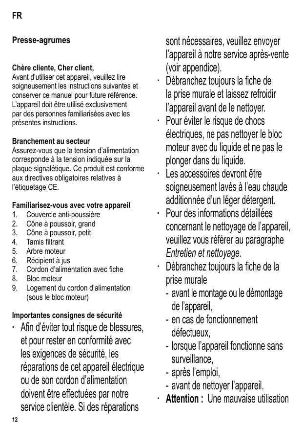 Presse-agrumes Chère cliente, Cher client, Avant d’utiliser cet appareil, veuillez lire soigneusement les instructions suivantes et conserver ce manuel pour future référence. L’appareil doit être utilisé exclusivement par des personnes familiarisées avec les présentes instructions. Branchement au secteur Assurez-vous que la tension d’alimentation corresponde à la tension indiquée sur la plaque signalétique. Ce produit est conforme aux directives obligatoires relatives à l’étiquetage CE. Familiarisez-vous avec votre appareil