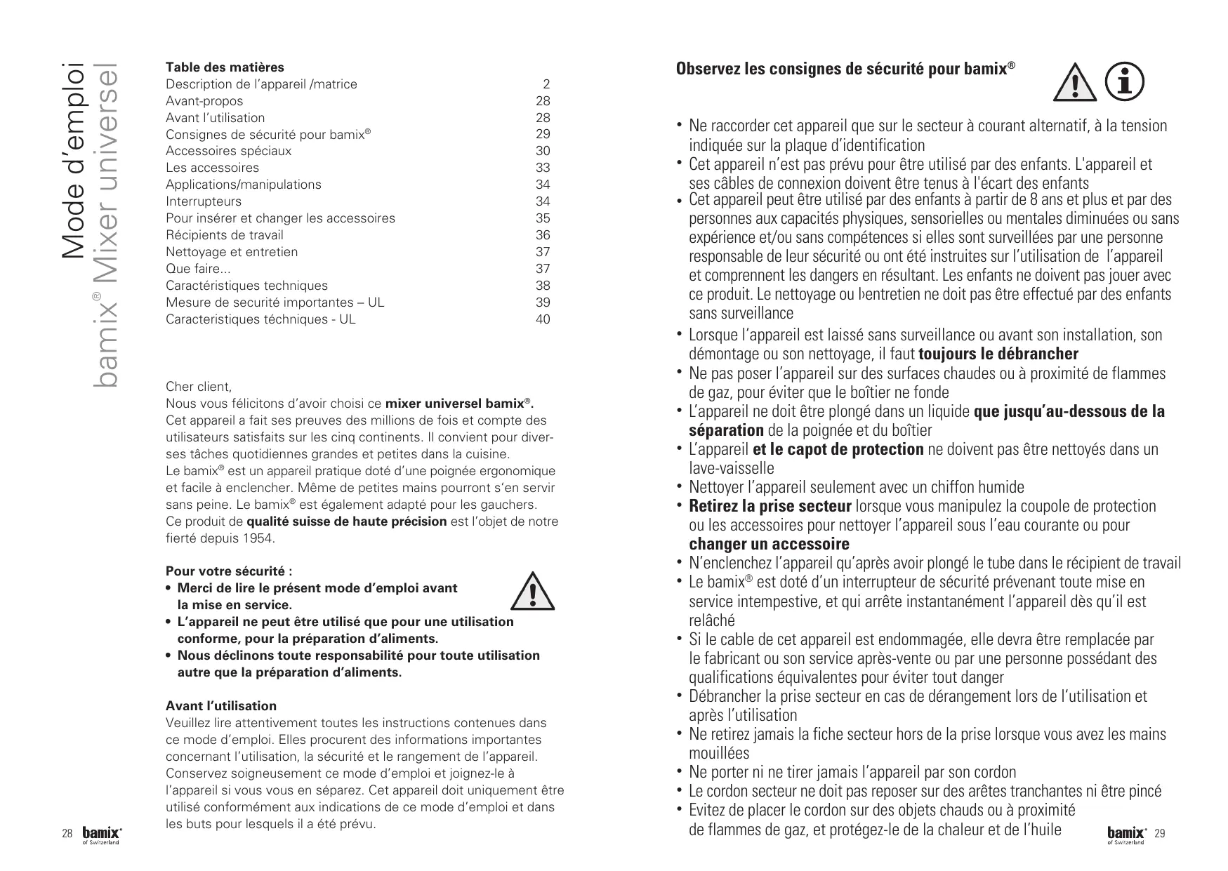 Cher client, Nous vous félicitons d’avoir choisi ce mixer universel bamix®. Cet appareil a fait ses preuves des millions de fois et compte des utilisateurs satisfaits sur les cinq continents. Il convient pour diverses tâches quotidiennes grandes et petites dans la cuisine. Le bamix® est un appareil pratique doté d’une poignée ergonomique et facile à enclencher. Même de petites mains pourront s‘en servir sans peine. Le bamix® est également adapté pour les gauchers. Ce produit de qualité suisse de haute précision est l’objet de notre fierté depuis 1954. Pour votre sécurité :