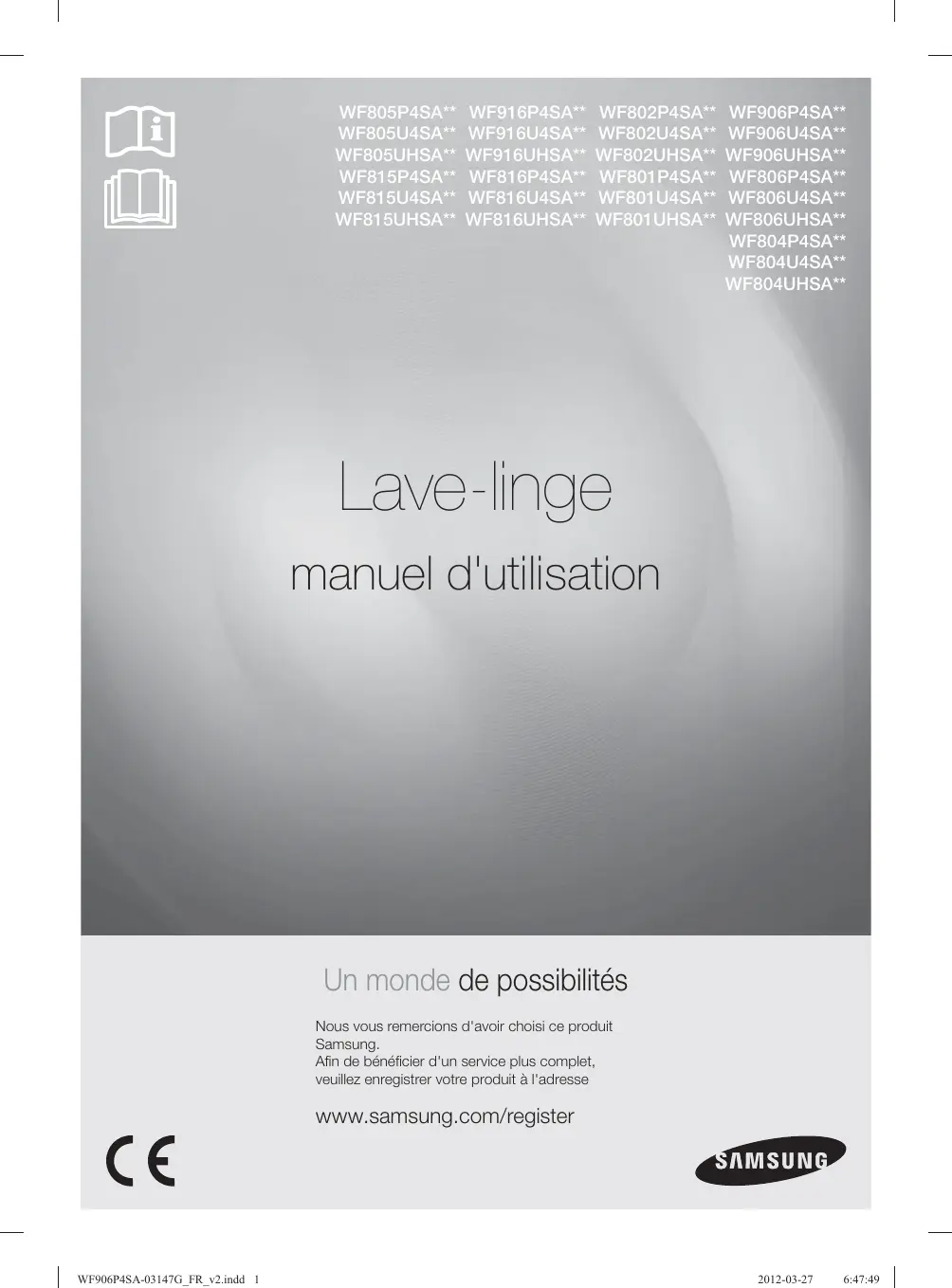 www.samsung.com Codenr. DC68-03147G_NL WF906P4SA-03147G_NL_v1.indd 46 2012-03-15 5:38:13 WF805P4SA** WF805U4SA** WF805UHSA** WF815P4SA** WF815U4SA** WF815UHSA** WF916P4SA** WF916U4SA** WF916UHSA** WF816P4SA** WF816U4SA** WF816UHSA** WF802P4SA** WF802U4SA** WF802UHSA** WF801P4SA** WF801U4SA** WF801UHSA** WF906P4SA** WF906U4SA** WF906UHSA** WF806P4SA** WF806U4SA** WF806UHSA** WF804P4SA** WF804U4SA** WF804UHSA** Lave-linge manuel d'utilisation Un monde de possibilités Nous vous remercions d'avoir choisi ce produit Samsung. Afin de bénéficier d'un service plus complet, veuillez enregistrer votre produit à l'adresse www.samsung.com/register WF906P4SA-03147G_FR_v2.indd 1 2012-03-27 6:47:49 Caractéristiques de votre nouveau lave-linge Samsung Avec ce nouveau lave-linge, faire une lessive prend un tout autre sens. Fonction spéciale Eco Bubble, économies d'énergie, etc. : le nouveau lave-linge Samsung possède toutes les caractéristiques qui transformeront la lessive en un véritable jeu d'enfant.
