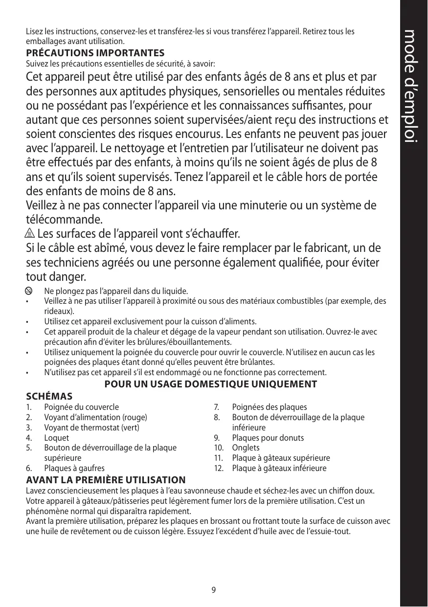 Votre appareil à gâteaux/pâtisseries peut légèrement fumer lors de la première utilisation. C’est un phénomène normal qui disparaîtra rapidement. Avant la première utilisation, préparez les plaques en brossant ou frottant toute la surface de cuisson avec une huile de revêtement ou de cuisson légère. Essuyez l’excédent d’huile avec de l’essuie-tout.