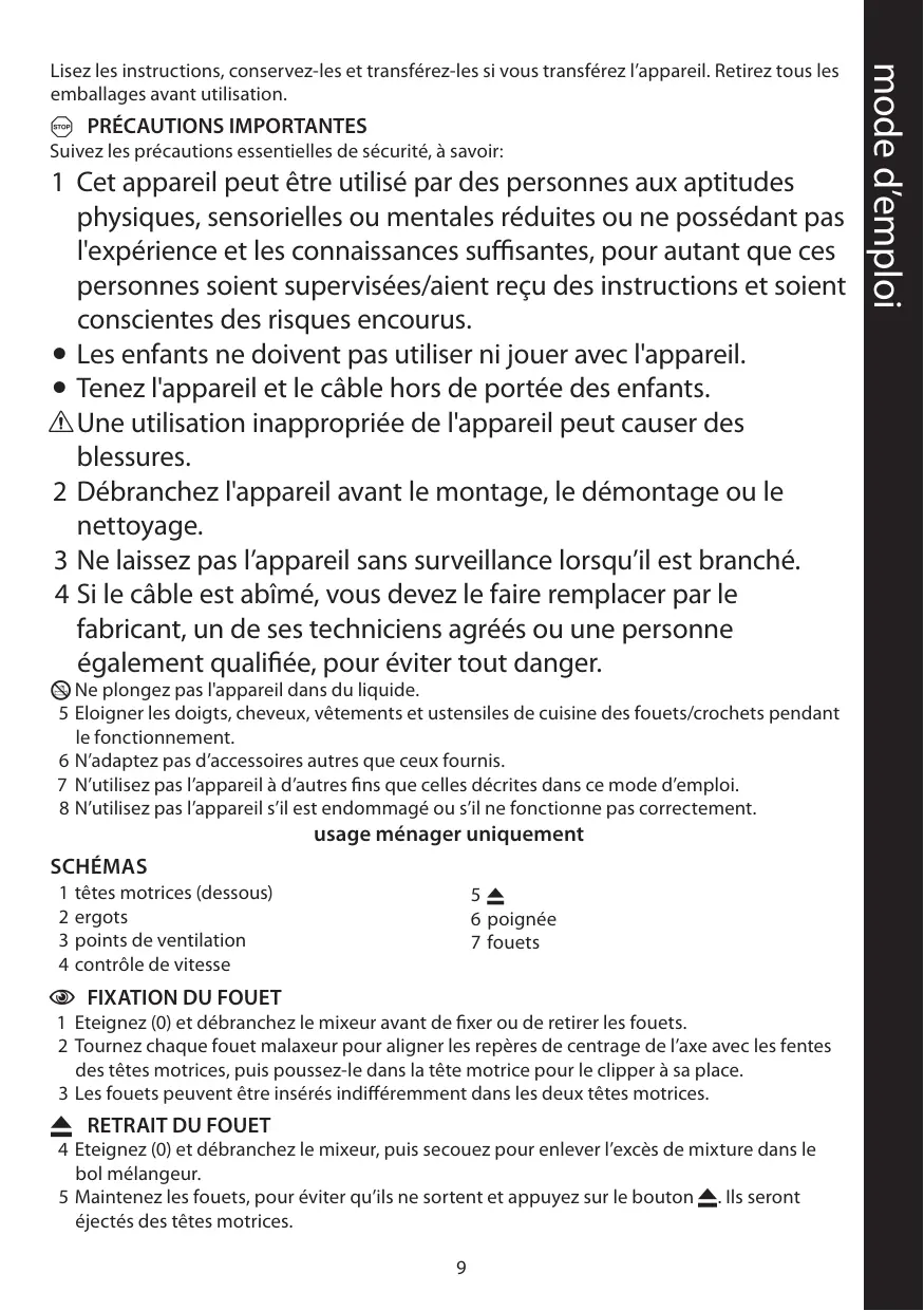 • Les enfants ne doivent pas utiliser ni jouer avec l'appareil. • Tenez l'appareil et le câble hors de portée des enfants. c Une utilisation inappropriée de l'appareil peut causer des blessures. 2 Débranchez l'appareil avant le montage, le démontage ou le nettoyage. 3 Ne laissez pas l’appareil sans surveillance lorsqu’il est branché. 4 Si le câble est abîmé, vous devez le faire remplacer par le fabricant, un de ses techniciens agréés ou une personne également qualifiée, pour éviter tout danger. L Ne plongez pas l'appareil dans du liquide. 5 Eloigner les doigts, cheveux, vêtements et ustensiles de cuisine des fouets/crochets pendant le fonctionnement. 6 N’adaptez pas d’accessoires autres que ceux fournis. 7 N’utilisez pas l’appareil à d’autres fins que celles décrites dans ce mode d’emploi. 8 N’utilisez pas l’appareil s’il est endommagé ou s’il ne fonctionne pas correctement.