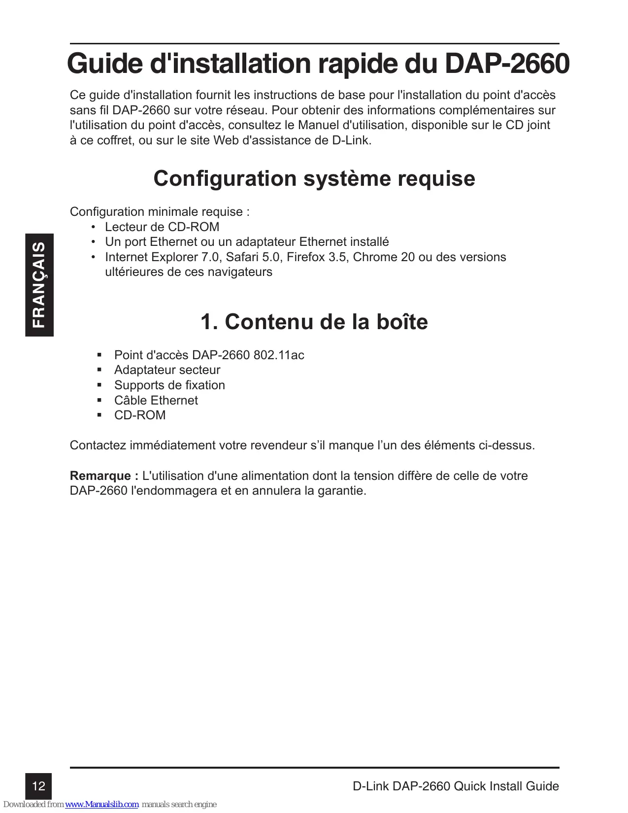 Guide d'installation rapide du DAP-2660 Ce guide d'installation fournit les instructions de base pour l'installation du point d'accès sans fil DAP-2660 sur votre réseau. Pour obtenir des informations complémentaires sur l'utilisation du point d'accès, consultez le Manuel d'utilisation, disponible sur le CD joint à ce coffret, ou sur le site Web d'assistance de D-Link. FRANÇAIS Configuration système requise Configuration minimale requise :