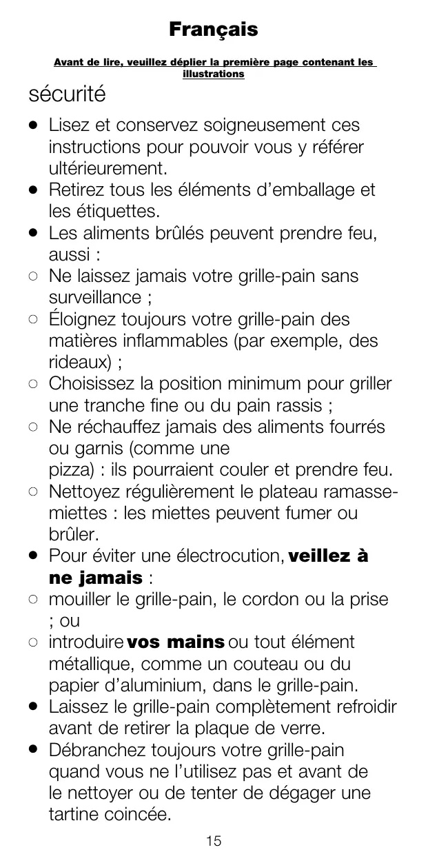 Retirez tous les éléments d’emballage et les étiquettes. Les aliments brûlés peuvent prendre feu, aussi : Ne laissez jamais votre grille-pain sans surveillance ; Éloignez toujours votre grille-pain des matières inflammables (par exemple, des rideaux) ; Choisissez la position minimum pour griller une tranche fine ou du pain rassis ; Ne réchauffez jamais des aliments fourrés ou garnis (comme une pizza) : ils pourraient couler et prendre feu. Nettoyez régulièrement le plateau ramassemiettes : les miettes peuvent fumer ou brûler. Pour éviter une électrocution, veillez à ne jamais : mouiller le grille-pain, le cordon ou la prise ; ou introduire vos mains ou tout élément métallique, comme un couteau ou du papier d’aluminium, dans le grille-pain. Laissez le grille-pain complètement refroidir avant de retirer la plaque de verre. Débranchez toujours votre grille-pain quand vous ne l’utilisez pas et avant de le nettoyer ou de tenter de dégager une tartine coincée. 15