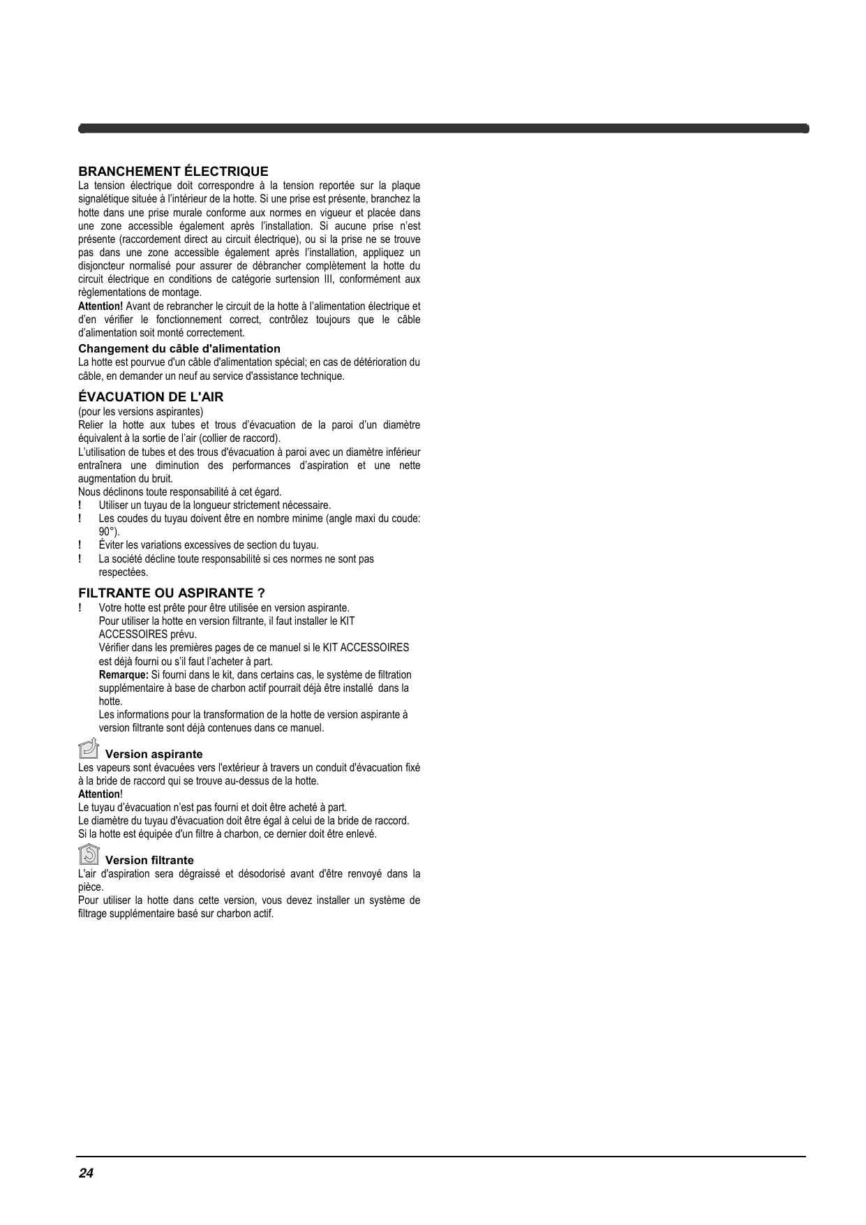 Votre hotte est prête pour être utilisée en version aspirante. Pour utiliser la hotte en version filtrante, il faut installer le KIT ACCESSOIRES prévu. Vérifier dans les premières pages de ce manuel si le KIT ACCESSOIRES est déjà fourni ou s’il faut l’acheter à part. Remarque: Si fourni dans le kit, dans certains cas, le système de filtration supplémentaire à base de charbon actif pourrait déjà être installé dans la hotte. Les informations pour la transformation de la hotte de version aspirante à version filtrante sont déjà contenues dans ce manuel.