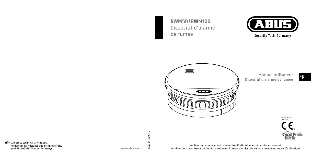 Rookmelder EN14604-2005/ AC-2008 Nous nous réservons le droit de toutes modifications techniques. Nous n’assumons aucune responsabilité pour des erreurs ou défauts d’impression éventuels. © ABUS | D-58292 Wetter (Germany) www.abus.com © ABUS 06/2015