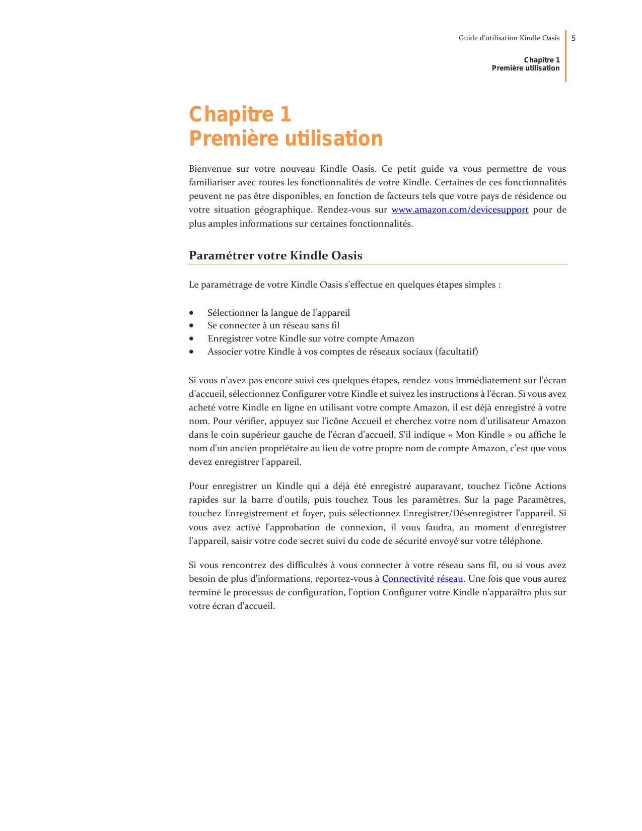 Première utilisation Bienvenue sur votre nouveau Kindle Oasis. Ce petit guide va vous permettre de vous familiariser avec toutes les fonctionnalités de votre Kindle. Certaines de ces fonctionnalités peuvent ne pas être disponibles, en fonction de facteurs tels que votre pays de résidence ou votre situation géographique. Rendez-vous sur www.amazon.com/devicesupport pour de plus amples informations sur certaines fonctionnalités. Paramétrer votre Kindle Oasis Le paramétrage de votre Kindle Oasis s'effectue en quelques étapes simples :