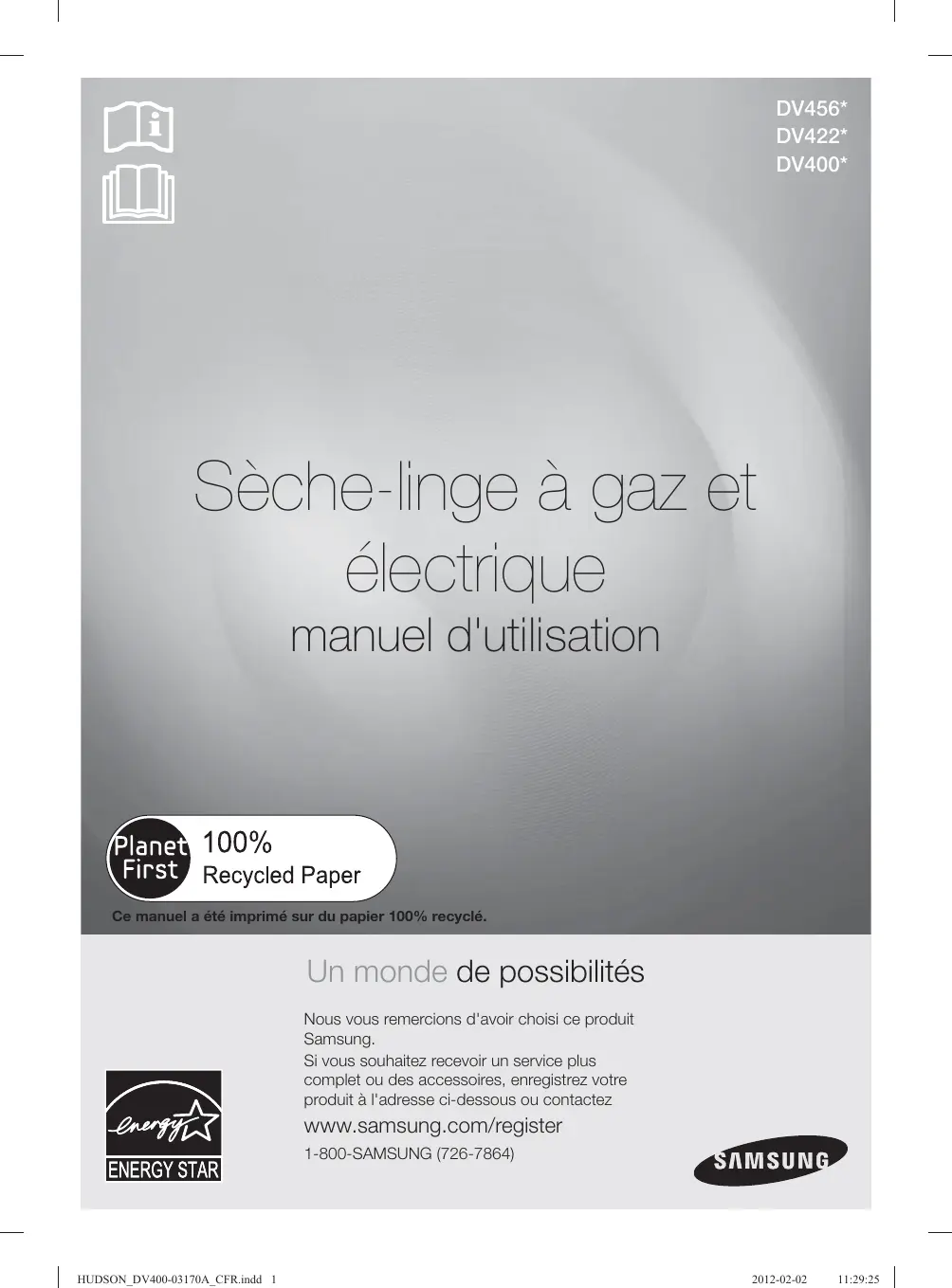 Sèche-linge à gaz et électrique manuel d'utilisation Ce manuel a été imprimé sur du papier 100% recyclé. Un monde de possibilités Nous vous remercions d'avoir choisi ce produit Samsung. Si vous souhaitez recevoir un service plus complet ou des accessoires, enregistrez votre produit à l'adresse ci-dessous ou contactez caractéristiques