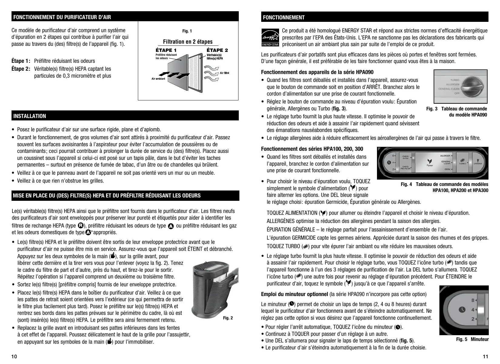 Ce produit a été homologué ENERGY STAR et répond aux strictes normes d’efficacité énergétique prescrites par l’EPA des États-Unis. L’EPA ne sanctionne pas les déclarations des fabricants qui préconisent un air ambiant plus sain par suite de l’emploi de ce produit. Les purificateurs d’air portatifs sont plus efficaces dans les pièces où portes et fenêtres sont fermées. D’une façon générale, il est préférable de les faire fonctionner quand vous êtes à la maison. Fonctionnement des appareils de la série HPA090 • Quand les filtres sont déballés et installés dans l’appareil, assurez-vous que le bouton de commande soit en position d’ARRÊT. Branchez alors le cordon d’alimentation sur une prise de courant fonctionnelle. • Réglez le bouton de commande au niveau d’épuration voulu: Épuration générale, Allergènes ou Turbo (fig. 3). Fig. 3 Tableau de commande du modèle HPA090 • Le réglage turbo fournit la plus haute vitesse. Il optimise le pouvoir de réduction des odeurs et aide à assainir l’air rapidement quand sévissent des émanations nauséabondes spécifiques. • Le réglage allergènes aide à réduire efficacement les aéroallergènes de l’air qui passe à travers le filtre. Fonctionnement des séries HPA100, 200, 300 • Quand les filtres sont déballés et installés dans l’appareil, branchez le cordon d’alimentation sur une prise de courant fonctionnelle. • Pour choisir le niveau d’épuration voulu, TOQUEZ Fig. 4 Tableau de commande des modèles simplement le symbole d’alimentation ( ) pour HPA100, HPA200 et HPA300 faire alterner les options. Une DEL bleue signale le réglage choisi: épuration Germicide, Épuration générale ou Allergènes. TOQUEZ ALIMENTATION ( ) pour allumer ou éteindre l’appareil et choisir le niveau d’épuration. ALLERGÈNES optimise la réduction des allergènes pendant la saison des allergies. ÉPURATION GÉNÉRALE – le réglage parfait pour l’assainissement d’ensemble de l’air. L’épuration GERMICIDE capte les germes aériens. Appréciée durant la saison des rhumes et des grippes. TOQUEZ TURBO ( ) pour vite épurer l’air ambiant ou vite réduire les mauvaises odeurs. • Le réglage turbo fournit la plus haute vitesse. Il optimise le pouvoir de réduction des odeurs et aide à assainir l’air rapidement. Pour choisir le réglage turbo, vous TOQUEZ l’icône turbo ( ) tandis que l’appareil fonctionne à l’un des 3 réglages de purification de l’air. La DEL turbo s’allumera. TOQUEZ l’icône turbo ( ) une autre fois pour revenir au réglage d’épuration précédent. Pour ÉTEINDRE le purificateur d’air, toquez le symbole ( ) jusqu’à ce que l’appareil s’arrête. Emploi du minuteur optionnel (la série HPA090 n’incorpore pas cette option) Le minuteur ( ) permet de choisir un laps de temps (2, 4 ou 8 heures) durant lequel le purificateur d’air fonctionnera avant de s’éteindre automatiquement. Ne réglez pas cette option si vous désirez que l’appareil fonctionne continuellement. • Pour régler l’arrêt automatique, TOQUEZ l’icône du minuteur ( ). • Continuez à TOQUER pour passer d’un réglage à un autre. • Une DEL s’allumera pour signaler le laps de temps sélectionné (fig. 5). • Le purificateur d’air s’éteindra automatiquement à la fin de la durée choisie.