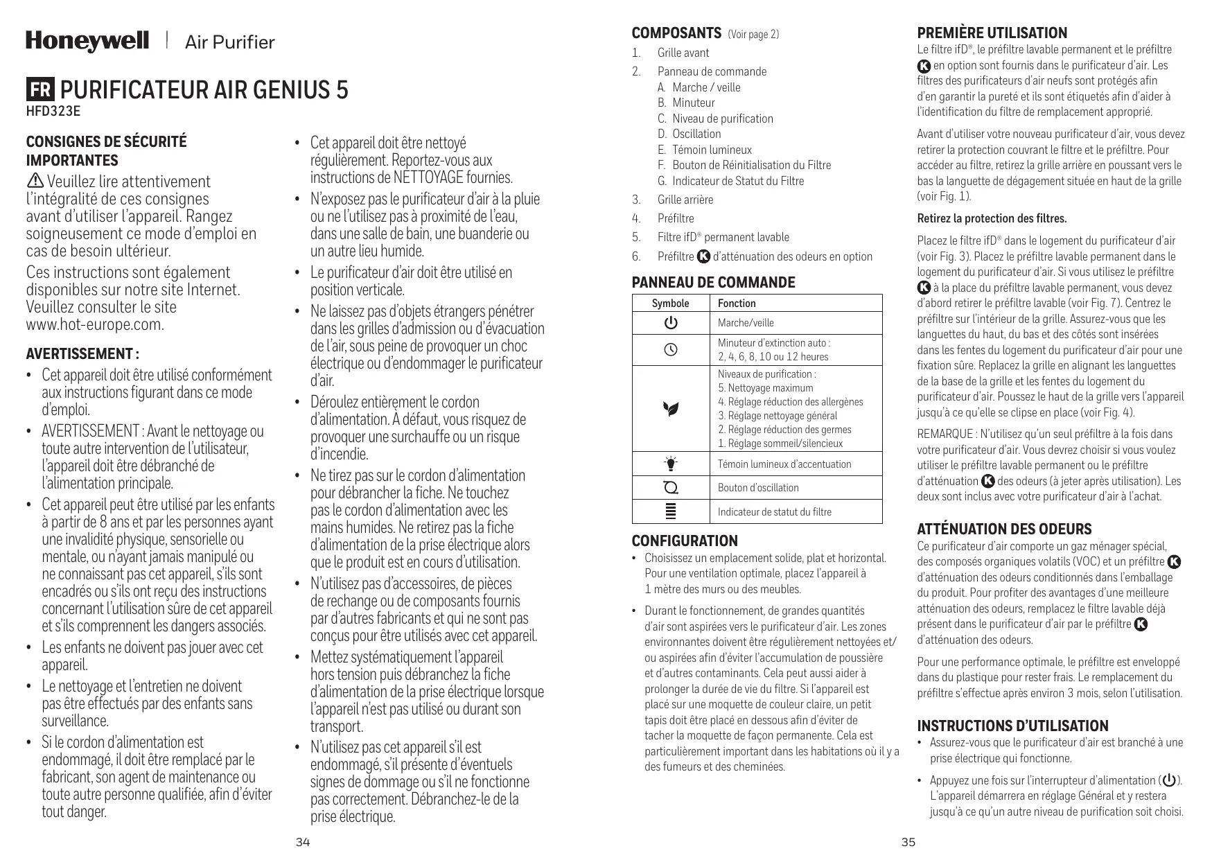Tensión 2014/35/UE y la Directiva RoHS 2011/65/UE. Nos reservamos el derecho a introducir modificaciones técnicas HFD323E Rangez dans une salle de bain, une buanderie ou soigneusement ce mode d’emploi en un autre lieu humide. cas de besoin ultérieur. Air Purifier • Le purificateur d’air doit être utilisé en Ces instructions sont également position verticale. disponibles sur notre site Internet. Veuillez consulter le site • Ne laissez pas d’objets étrangers pénétrer www.hot-europe.com. dans les grilles d’admission ou d’évacuation de l’air, sous peine de provoquer un choc AVERTISSEMENT : électrique ou d’endommager le purificateur • Cet appareil doit être utilisé conformément d’air. aux instructions figurant dans ce mode • Déroulez entièrement le cordon d’emploi. d’alimentation. À défaut, vous risquez de • AVERTISSEMENT : Avant le nettoyage ou provoquer une surchauffe ou un risque toute autre intervention de l’utilisateur, d’incendie. l’appareil doit être débranché de • Ne tirez pas sur le cordon d’alimentation l’alimentation principale. pour débrancher la fiche. Ne touchez • Cet appareil peut être utilisé par les enfants pas le cordon d’alimentation avec les à partir de 8 ans et par les personnes ayant mains humides. Ne retirez pas la fiche une invalidité physique, sensorielle ou d’alimentation de la prise électrique alors mentale, ou n’ayant jamais manipulé ou que le produit est en cours d’utilisation. ne connaissant pas cet appareil, s’ils sont • N’utilisez pas d’accessoires, de pièces encadrés ou s’ils ont reçu des instructions de rechange ou de composants fournis concernant l’utilisation sûre de cet appareil par d’autres fabricants et qui ne sont pas et s’ils comprennent les dangers associés. conçus pour être utilisés avec cet appareil. • Les enfants ne doivent pas jouer avec cet • Mettez systématiquement l’appareil appareil. hors tension puis débranchez la fiche • Le nettoyage et l’entretien ne doivent d’alimentation de la prise électrique lorsque pas être effectués par des enfants sans l’appareil n’est pas utilisé ou durant son surveillance. transport. • Si le cordon d’alimentation est • N’utilisez pas cet appareil s’il est endommagé, il doit être remplacé par le endommagé, s’il présente d’éventuels fabricant, son agent de maintenance ou signes de dommage ou s’il ne fonctionne toute autre personne qualifiée, afin d’éviter pas correctement. Débranchez-le de la tout danger. prise électrique. CONSIGNES DE SÉCURITÉ IMPORTANTES