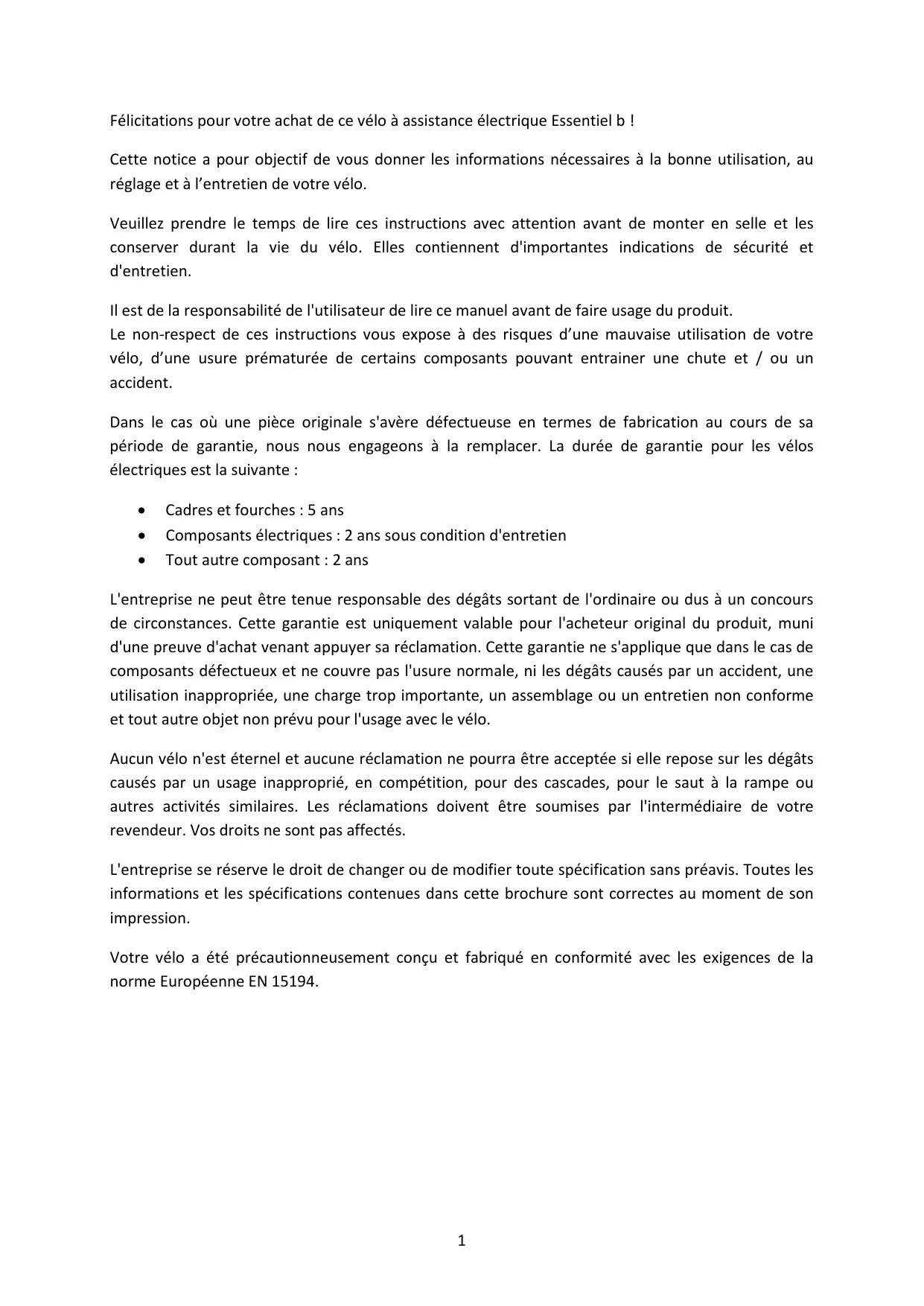 Félicitations pour votre achat de ce vélo à assistance électrique Essentiel b ! Cette notice a pour objectif de vous donner les informations nécessaires à la bonne utilisation, au réglage et à l’entretien de votre vélo. Veuillez prendre le temps de lire ces instructions avec attention avant de monter en selle et les conserver durant la vie du vélo. Elles contiennent d'importantes indications de sécurité et d'entretien. Il est de la responsabilité de l'utilisateur de lire ce manuel avant de faire usage du produit. Le non-respect de ces instructions vous expose à des risques d’une mauvaise utilisation de votre vélo, d’une usure prématurée de certains composants pouvant entrainer une chute et / ou un accident. Dans le cas où une pièce originale s'avère défectueuse en termes de fabrication au cours de sa période de garantie, nous nous engageons à la remplacer. La durée de garantie pour les vélos électriques est la suivante :