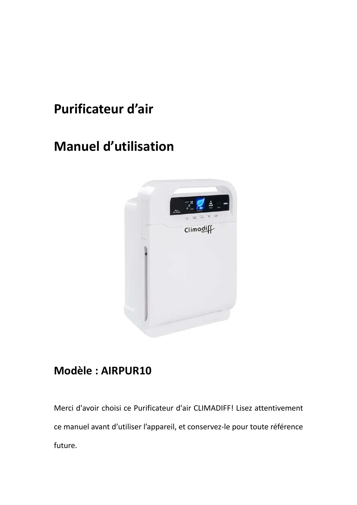 Purificateur d’air Manuel d’utilisation Modèle : AIRPUR10 Merci d'avoir choisi ce Purificateur d'air CLIMADIFF! Lisez attentivement ce manuel avant d’utiliser l’appareil, et conservez-le pour toute référence future. ENVIRONNEMENT Lors de l’utilisation de ce produit dans un pays européen, les instructions suivantes doivent être respectées : FIN DE VIE DU PRODUIT : Ne jetez pas ce produit avec les déchets ménagers non triés. La collecte de ce produit en tant qu’ordure nécessite un traitement spécial. Plusieurs possibilités: A) La municipalité a mis en place des systèmes de collecte, où les déchets électroniques peuvent être éliminés sans frais pour l'utilisateur. B) Lors de l'achat d'un nouveau produit, le détaillant reprendra l'ancien produit gratuitement. C) La fabriquant reprend l'appareil pour l'élimination sans frais pour l'utilisateur. D) D’anciens produits contiennent de précieuses ressources, ils peuvent être vendus à des revendeurs de ferraille. L'élimination sauvage de déchets dans les forêts et les paysages est dangereuse pour la santé, des substances dangereuses peuvent fuir dans le sol et l'eau et se retrouver dans la chaîne alimentaire.