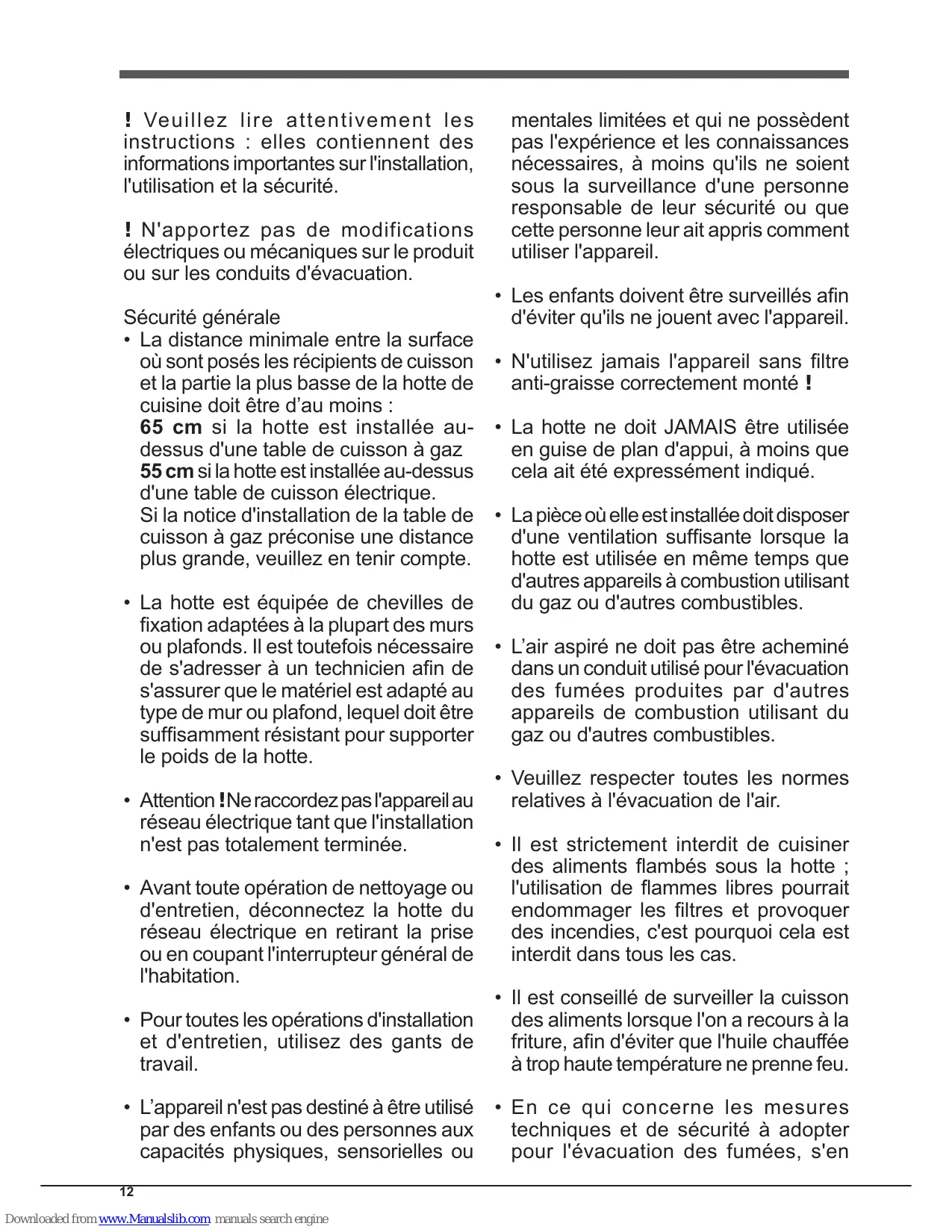 ! N'apportez pas de modifications électriques ou mécaniques sur le produit ou sur les conduits d'évacuation. Sécurité générale • La distance minimale entre la surface où sont posés les récipients de cuisson et la partie la plus basse de la hotte de cuisine doit être d’au moins : 65 cm si la hotte est installée audessus d'une table de cuisson à gaz 55 cm si la hotte est installée au-dessus d'une table de cuisson électrique. Si la notice d'installation de la table de cuisson à gaz préconise une distance plus grande, veuillez en tenir compte. • La hotte est équipée de chevilles de fixation adaptées à la plupart des murs ou plafonds. Il est toutefois nécessaire de s'adresser à un technicien afin de s'assurer que le matériel est adapté au type de mur ou plafond, lequel doit être suffisamment résistant pour supporter le poids de la hotte. • Attention ! Ne raccordez pas l'appareil au réseau électrique tant que l'installation n'est pas totalement terminée. • Avant toute opération de nettoyage ou d'entretien, déconnectez la hotte du réseau électrique en retirant la prise ou en coupant l'interrupteur général de l'habitation.