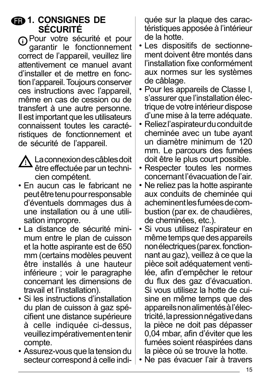 Les dispositifs de sectionnement doivent être montés dans l’installation fixe conformément aux normes sur les systèmes de câblage. Pour les appareils de Classe I, s’assurer que l’installation électrique de votre intérieur dispose d’une mise à la terre adéquate. Reliez l’aspirateur du conduit de cheminée avec un tube ayant un diamètre minimum de 120 mm. Le parcours des fumées doit être le plus court possible. Respecter toutes les normes concernant l’évacuation de l’air. Ne reliez pas la hotte aspirante aux conduits de cheminée qui acheminent les fumées de combustion (par ex. de chaudières, de cheminées, etc.). Si vous utilisez l’aspirateur en même temps que des appareils non électriques (par ex. fonctionnant au gaz), veillez à ce que la pièce soit adéquatement ventilée, afin d’empêcher le retour du flux des gaz d’évacuation. Si vous utilisez la hotte de cuisine en même temps que des appareils non alimentés à l’électricité, la pression négative dans la pièce ne doit pas dépasser 0,04 mbar, afin d’éviter que les fumées soient réaspirées dans la pièce où se trouve la hotte. Ne pas évacuer l’air à travers 15