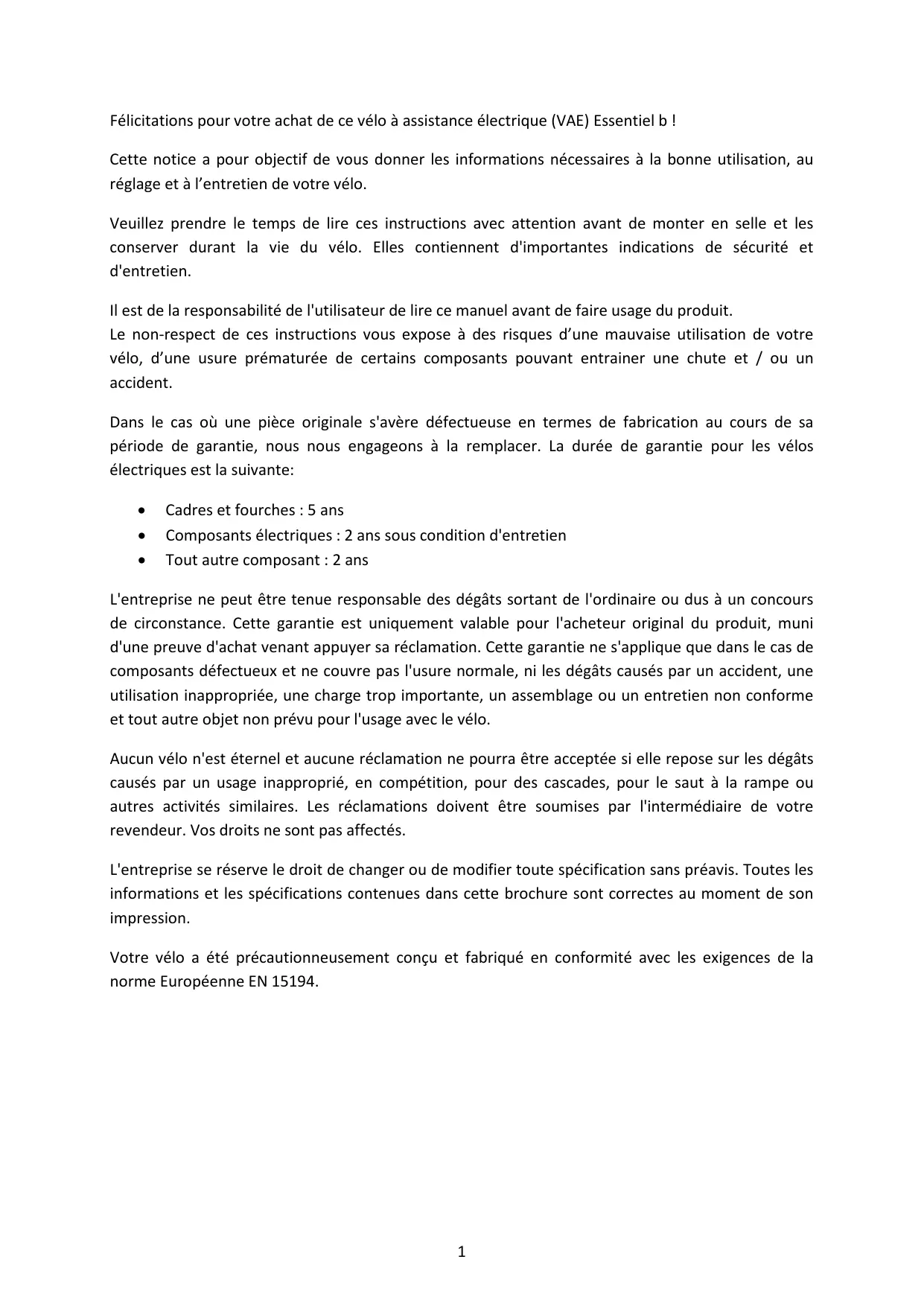 Félicitations pour votre achat de ce vélo à assistance électrique (VAE) Essentiel b!