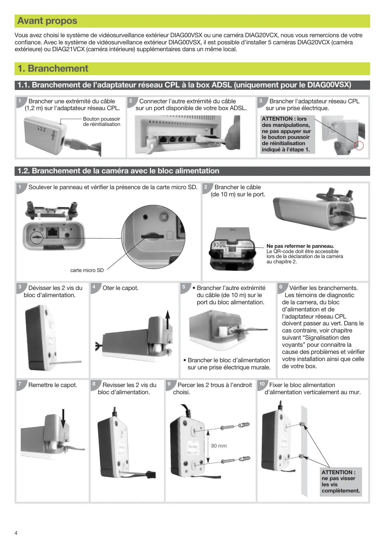 Nutzung, Veröffentlichung oder Verteilung von Bild- und/oder Tonaufnahmen). Achten Sie bei der Nutzung der Produkte und Dienstleistungen von Diagral darauf, dass Sie die am jeweiligen Ort geltenden Gesetze einhalten. 1.2. Branchement de la caméra avec le bloc alimentation 1