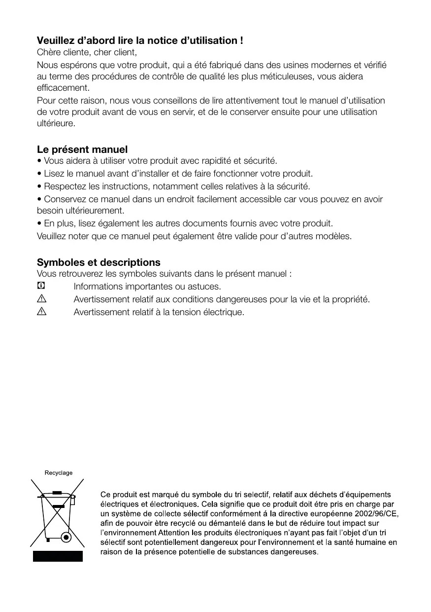 Chère cliente, cher client, Nous espérons que votre produit, qui a été fabriqué dans des usines modernes et vérifié au terme des procédures de contrôle de qualité les plus méticuleuses, vous aidera efficacement. Pour cette raison, nous vous conseillons de lire attentivement tout le manuel d’utilisation de votre produit avant de vous en servir, et de le conserver ensuite pour une utilisation ultérieure.