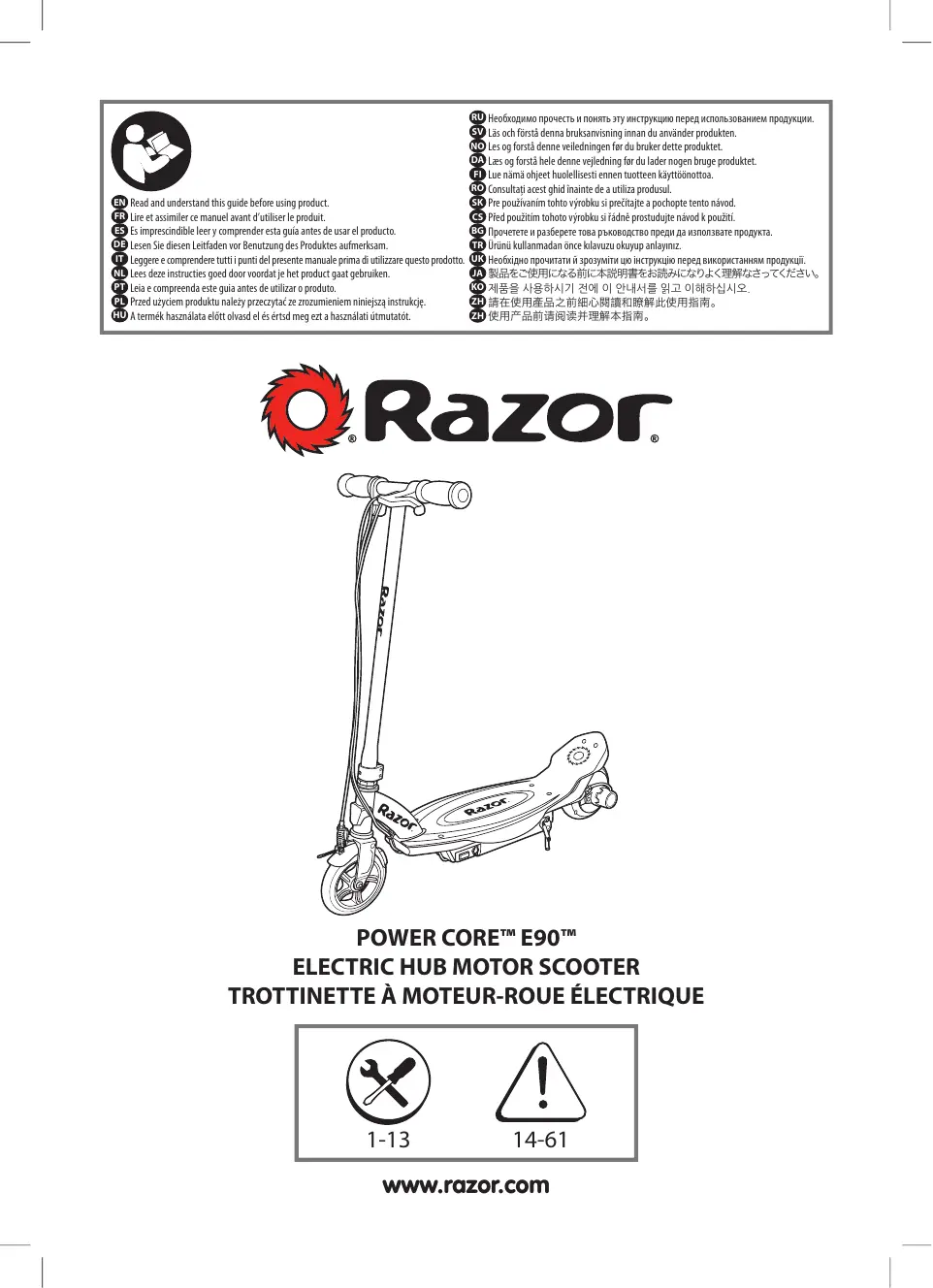 Sostituire la ruota anteriore Voorwiel vervangen Substituir a roda da frente LES PARENTS ET LES ADULTES SURVEILLANT LES ENFANTS DOIVENT LEUR ENSEIGNER COMMENT UTILISER SANS DANGER CETTE TROTTINETTE. Si l’utilisateur ne fait pas usage de bon sens et ne respecte pas ces avertissements, il y a un risque accru de dommages ou de blessures graves, voire mortelles. L’utilisation d’une trottinette électrique présente des risques potentiels. • Comme tout autre produit mobile, une trottinette électrique peut être dangereuse (par exemple, on peut tomber ou être confronté à une situation dangereuse). Il va de soi que les trottinettes électriques sont conçues pour se déplacer; il est donc possible que l’utilisateur perde la maîtrise ou soit confronté à des situations dangereuses. • Les enfants et les adultes chargés de les surveiller doivent comprendre que si une telle situation se présente, un utilisateur peut subir des blessures graves, voire mortelles, même s’il utilise l’équipement de sécurité et qu’il respecte les autres précautions de sécurité. UTILISER LES TROTTINETTES À VOS PROPRES RISQUES ET FAIRE PREUVE DE BON SENS. La responsabilité et la supervision d’un parent et d’un adulte sont nécessaires Parce que les trottinettes peuvent être dangereuses et que tout produit n’est pas approprié aux enfants de tout âge ou de toute taille, il existe différentes recommandations relatives à l’âge dans cette catégorie de produits, qui ont pour but de refléter la nature des dangers et les capacités physiques ou mentales prévues, ou les deux, qu’un enfant possède pour faire face aux dangers. Les parents et les adultes chargés de surveiller les enfants doivent choisir des produits mobiles adaptés à l’âge de l’enfant qui utilisera la trottinette électrique et prendre les précautions afin d’éviter que les enfants trop immatures ou inexpérimentés pour les caractéristiques d’un produit se mettent en danger. • L’âge recommandé pour un utilisateur de la trottinette électrique Razor Power Core E90 est de 8 ans ou plus.. Toute personne, même âgée de 8 ans ou plus, ne se sentant pas à l’aise sur la trottinette ne doit pas essayer de l’utiliser. Les parents doivent décider de permettre ou non à leur enfant d’utiliser ce produit en fonction de sa maturité, de ses capacités et de son aptitude à respecter les consignes. Tenir ce produit hors de portée des enfants en bas âge et se rappeler qu’il est exclusivement destiné à des personnes qui, au minimum, se sentent totalement à l’aise et compétentes pour utiliser la trottinette. • Poids maxi. de l’utilisateur : 54 kg. • Toute personne présentant des problèmes mentaux ou physiques qui l’exposent aux blessures ou qui risquent de nuire à sa dextérité ou à sa capacité mentale de reconnaître, comprendre et suivre les directives de sécurité et à sa capacité de comprendre le danger relatif à l’utilisation d’une trottinette ne doit pas utiliser ou avoir la permission d’utiliser des produits inappropriés à ses capacités. Il faut prévenir les personnes souffrant de maladies cardiaques, de douleurs à la tête, au dos ou au cou (ou ayant subi des chirurgies à ces parties du corps) et les femmes enceintes de ne pas utiliser ces produits. Vérifier la trottinette avant l’utilisation – Effectuer un entretien après l’utilisation • Avant l’utilisation, confirmer que tous les garde-chaînes et autres protections sont bien en place et en bon état, et que le frein fonctionne correctement. S’assurer que la roue arrière ne présente aucun plat ni aucune usure excessive. • Après l’utilisation, entretenir et réparer la trottinette conformément aux spécifications du fabricant incluses dans le présent guide. Utiliser uniquement les pièces de rechange homologuées par le fabricant. Ne pas modifier la conception et la configuration d’origine de cette trottinette. Pratiques et conditions d’utilisation acceptables – Les parents ou les adultes doivent discuter de ces règles avec leurs enfants. Porter un équipement de protection. Ne pas utiliser au sein de la circulation. À quel endroit utiliser la trottinette • Toujours vérifier et respecter les lois ou règlementations locales applicables aux endroits où la trottinette électrique peut être utilisée. Maintenir constamment une distance de sécurité avec les véhicules motorisés et utiliser la trottinette avec précaution uniquement aux endroits autorisés. • Adopter une conduite défensive. Il faut veiller à éviter les piétons, les skaters, les skateboards/planches à roulettes, les trottinettes, les vélos, les enfants ou les animaux qui pourraient couper votre trajectoire. Respecter les droits et la propriété d’autrui. • La trottinette électrique est conçue pour être utilisée sur un sol plat et sec, comme des trottoirs ou des terrains plats exempts de débris comme du sable, des feuilles, des cailloux ou du gravier. • Les surfaces humides, glissantes, bosselées, inégales ou rugueuses peuvent réduire l’adhérence et augmenter les risques d’accident. • Ne pas utiliser trottinette électrique dans la boue, sur la glace, dans les flaques ou l’eau. • Prendre garde aux obstacles potentiels qui pourraient s’accrocher à la roue, vous forcer à tourner brusquement ou vous faire perdre le contrôle de la trottinette. • Éviter les bosses, les bouches d’égout et les changements brusques de surfaces. • Ne pas conduire la trottinette par temps humide ou en présence de verglas et ne jamais immerger la trottinette dans l’eau, car les éléments électriques et les organes de transmission pourraient être endommagés par l’eau ou créer d’autres conditions potentiellement dangereuses. • Ne jamais risquer d’endommager des surfaces comme de la moquette ou du revêtement de sol en utilisant une trottinette électrique à l’intérieu
