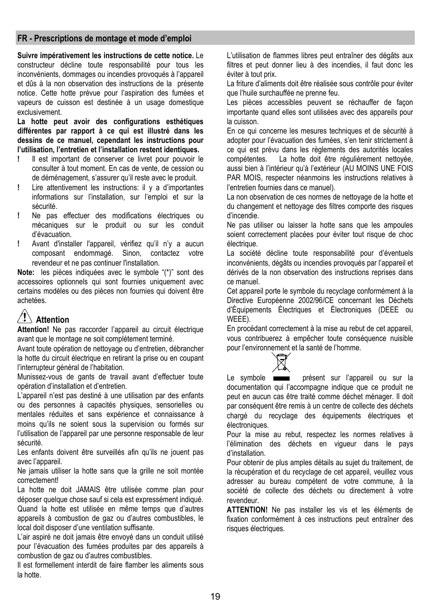 FR - Prescriptions de montage et mode d’emploi Suivre impérativement les instructions de cette notice. Le constructeur décline toute responsabilité pour tous les inconvénients, dommages ou incendies provoqués à l’appareil et dûs à la non observation des instructions de la présente notice. Cette hotte prévue pour l’aspiration des fumées et vapeurs de cuisson est destinée à un usage domestique exclusivement. La hotte peut avoir des configurations esthétiques différentes par rapport à ce qui est illustré dans les dessins de ce manuel, cependant les instructions pour l’utilisation, l’entretien et l’installation restent identiques. Il est important de conserver ce livret pour pouvoir le consulter à tout moment. En cas de vente, de cession ou de déménagement, s’assurer qu’il reste avec le produit. Lire attentivement les instructions: il y a d’importantes informations sur l’installation, sur l’emploi et sur la sécurité. Ne pas effectuer des modifications électriques ou mécaniques sur le produit ou sur les conduit d’évacuation. Avant d'installer l'appareil, vérifiez qu’il n’y a aucun composant endommagé. Sinon, contactez votre revendeur et ne pas continuer l'installation. Note: les pièces indiquées avec le symbole “(*)” sont des accessoires optionnels qui sont fournies uniquement avec certains modèles ou des pièces non fournies qui doivent être achetées. L’utilisation de flammes libres peut entraîner des dégâts aux filtres et peut donner lieu à des incendies, il faut donc les éviter à tout prix. La friture d’aliments doit être réalisée sous contrôle pour éviter que l’huile surchauffée ne prenne feu. Les pièces accessibles peuvent se réchauffer de façon importante quand elles sont utilisées avec des appareils pour la cuisson. En ce qui concerne les mesures techniques et de sécurité à adopter pour l’évacuation des fumées, s’en tenir strictement à ce qui est prévu dans les règlements des autorités locales compétentes. La hotte doit être régulièrement nettoyée, aussi bien à l’intérieur qu’à l’extérieur (AU MOINS UNE FOIS PAR MOIS, respecter néanmoins les instructions relatives à l’entretien fournies dans ce manuel). La non observation de ces normes de nettoyage de la hotte et du changement et nettoyage des filtres comporte des risques d’incendie. Ne pas utiliser ou laisser la hotte sans que les ampoules soient correctement placées pour éviter tout risque de choc électrique. La société décline toute responsabilité pour d’éventuels inconvénients, dégâts ou incendies provoqués par l’appareil et dérivés de la non observation des instructions reprises dans ce manuel. Cet appareil porte le symbole du recyclage conformément à la Directive Européenne 2002/96/CE concernant les Déchets d’Équipements Électriques et Électroniques (DEEE ou WEEE). En procédant correctement à la mise au rebut de cet appareil, vous contribuerez à empêcher toute conséquence nuisible pour l’environnement et la santé de l’homme. Attention Attention! Ne pas raccorder l’appareil au circuit électrique avant que le montage ne soit complètement terminé. Avant toute opération de nettoyage ou d’entretien, débrancher la hotte du circuit électrique en retirant la prise ou en coupant l’interrupteur général de l’habitation. Munissez-vous de gants de travail avant d’effectuer toute opération d’installation et d’entretien. L’appareil n’est pas destiné à une utilisation par des enfants ou des personnes à capacités physiques, sensorielles ou mentales réduites et sans expérience et connaissance à moins qu’ils ne soient sous la supervision ou formés sur l’utilisation de l’appareil par une personne responsable de leur sécurité. Les enfants doivent être surveillés afin qu’ils ne jouent pas avec l’appareil. Ne jamais utiliser la hotte sans que la grille ne soit montée correctement! La hotte ne doit JAMAIS être utilisée comme plan pour déposer quelque chose sauf si cela est expressément indiqué. Quand la hotte est utilisée en même temps que d’autres appareils à combustion de gaz ou d’autres combustibles, le local doit disposer d’une ventilation suffisante. L’air aspiré ne doit jamais être envoyé dans un conduit utilisé pour l’évacuation des fumées produites par des appareils à combustion de gaz ou d’autres combustibles. Il est formellement interdit de faire flamber les aliments sous la hotte. présent sur l’appareil ou sur la Le symbole documentation qui l’accompagne indique que ce produit ne peut en aucun cas être traité comme déchet ménager. Il doit par conséquent être remis à un centre de collecte des déchets chargé du recyclage des équipements électriques et électroniques. Pour la mise au rebut, respectez les normes relatives à l’élimination des déchets en vigueur dans le pays d’installation. Pour obtenir de plus amples détails au sujet du traitement, de la récupération et du recyclage de cet appareil, veuillez vous adresser au bureau compétent de votre commune, à la société de collecte des déchets ou directement à votre revendeur. ATTENTION! Ne pas installer les vis et les éléments de fixation conformément à ces instructions peut entraîner des risques électriques.