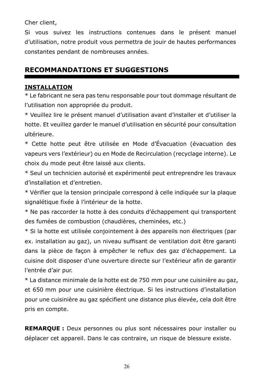 - La distance minimale de la hotte est de 750 mm pour une cuisinière au gaz, et 650 mm pour une cuisinière électrique. Si les instructions d’installation pour une cuisinière au gaz spécifient une distance plus élevée, cela doit être pris en compte. REMARQUE : Deux personnes ou plus sont nécessaires pour installer ou déplacer cet appareil. Dans le cas contraire, un risque de blessure existe.