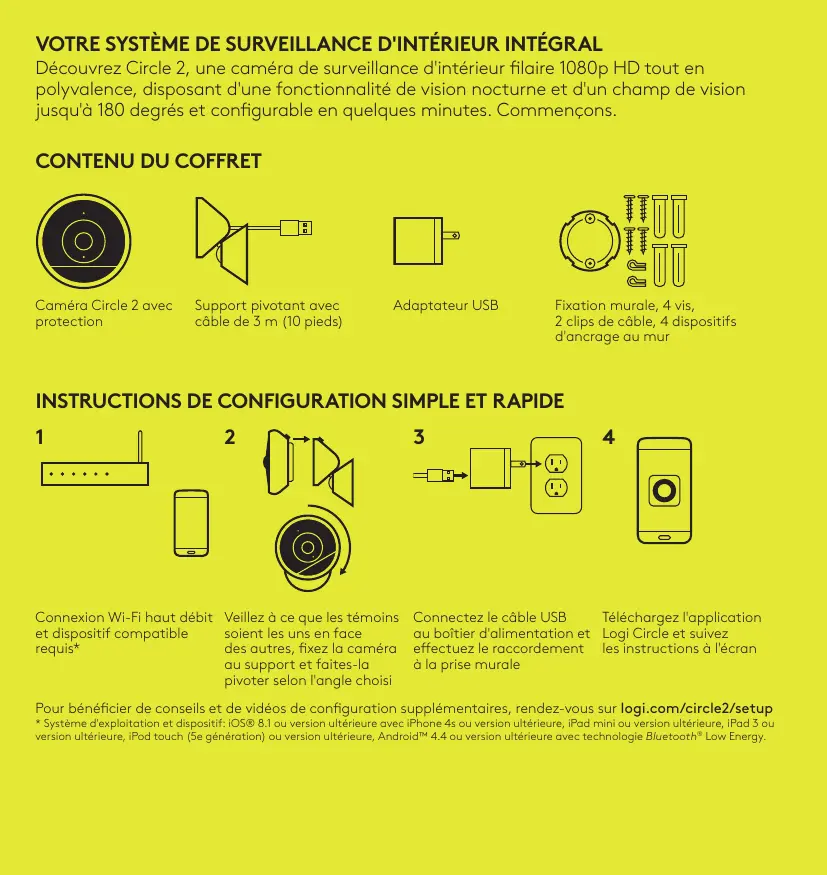Découvrez Circle 2, une caméra de surveillance d'intérieur filaire 1080p HD tout en polyvalence, disposant d'une fonctionnalité de vision nocturne et d'un champ de vision jusqu'à 180 degrés et configurable en quelques minutes. Commençons. Caméra Circle 2 avec protection Support pivotant avec câble de 3 m (10 pieds) Adaptateur USB Fixation murale, 4 vis, 2 clips de câble, 4 dispositifs d'ancrage au mur Connexion Wi-Fi haut débit Veillez à ce que les témoins et dispositif compatible soient les uns en face requis* des autres, fixez la caméra au support et faites-la pivoter selon l'angle choisi