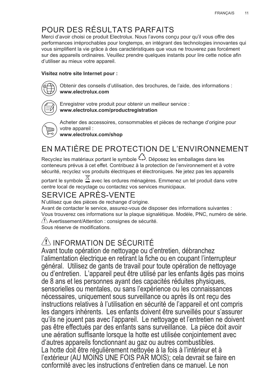 www.electrolux.com respect des instructions expressément fournies dans ce mode d’emploi concernant le nettoyage de la hotte et des filtres peut provoquer des risques d’incendie. Il est strictement interdit de flamber les aliments sous la hotte. L’utilisation d’une flamme nue est dommageable pour les filtres et peut causer un incendie, par conséquent, elles doivent être évitées de toute façon. La friture doit être faite avec soin afin de s’assurer que l’huile surchauffée ne prend pas feu.