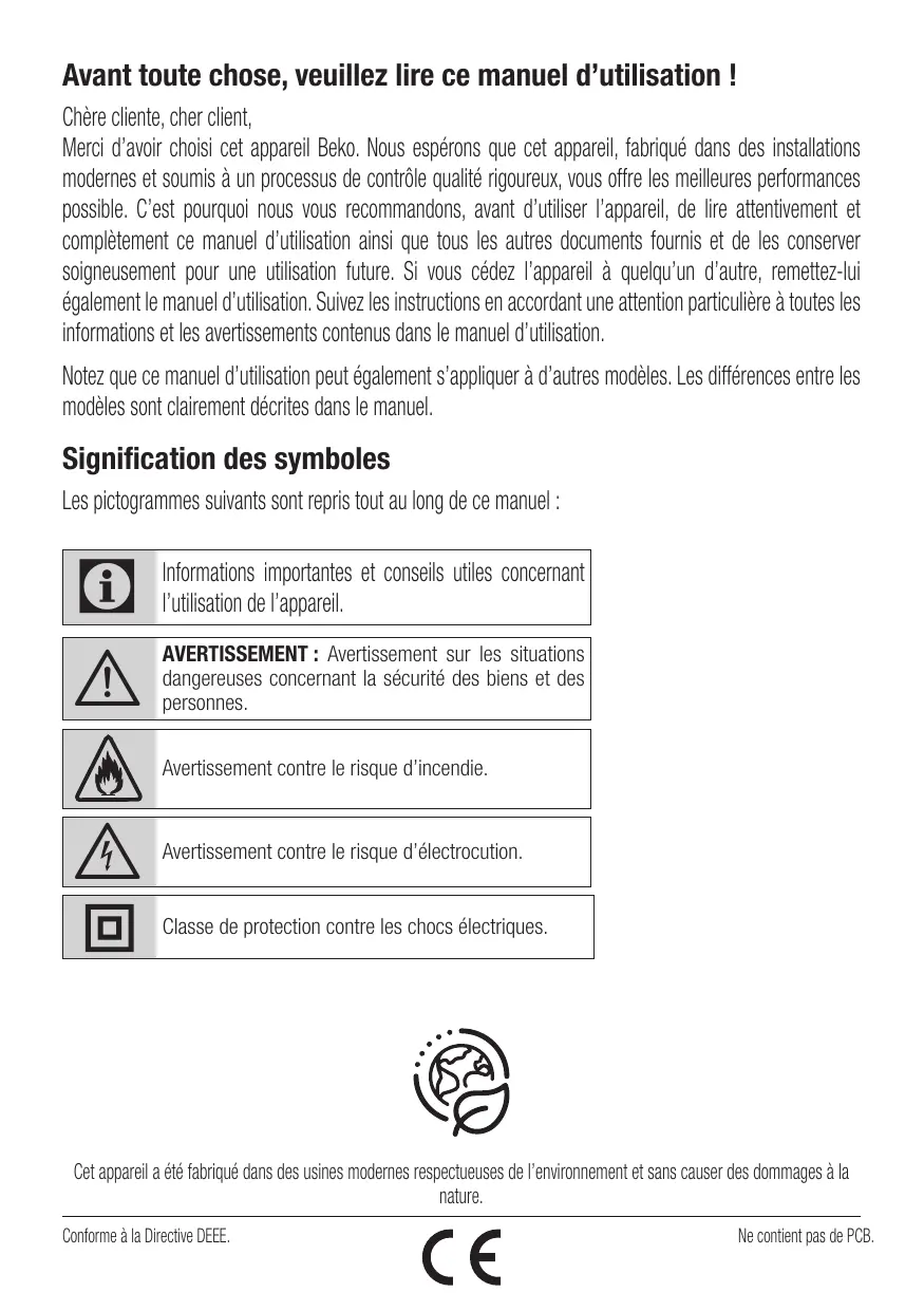 Chère cliente, cher client, Merci d’avoir choisi cet appareil Beko. Nous espérons que cet appareil, fabriqué dans des installations modernes et soumis à un processus de contrôle qualité rigoureux, vous offre les meilleures performances possible. C’est pourquoi nous vous recommandons, avant d’utiliser l’appareil, de lire attentivement et complètement ce manuel d’utilisation ainsi que tous les autres documents fournis et de les conserver soigneusement pour une utilisation future. Si vous cédez l’appareil à quelqu’un d’autre, remettez-lui également le manuel d’utilisation. Suivez les instructions en accordant une attention particulière à toutes les informations et les avertissements contenus dans le manuel d’utilisation. Notez que ce manuel d’utilisation peut également s’appliquer à d’autres modèles. Les différences entre les modèles sont clairement décrites dans le manuel.