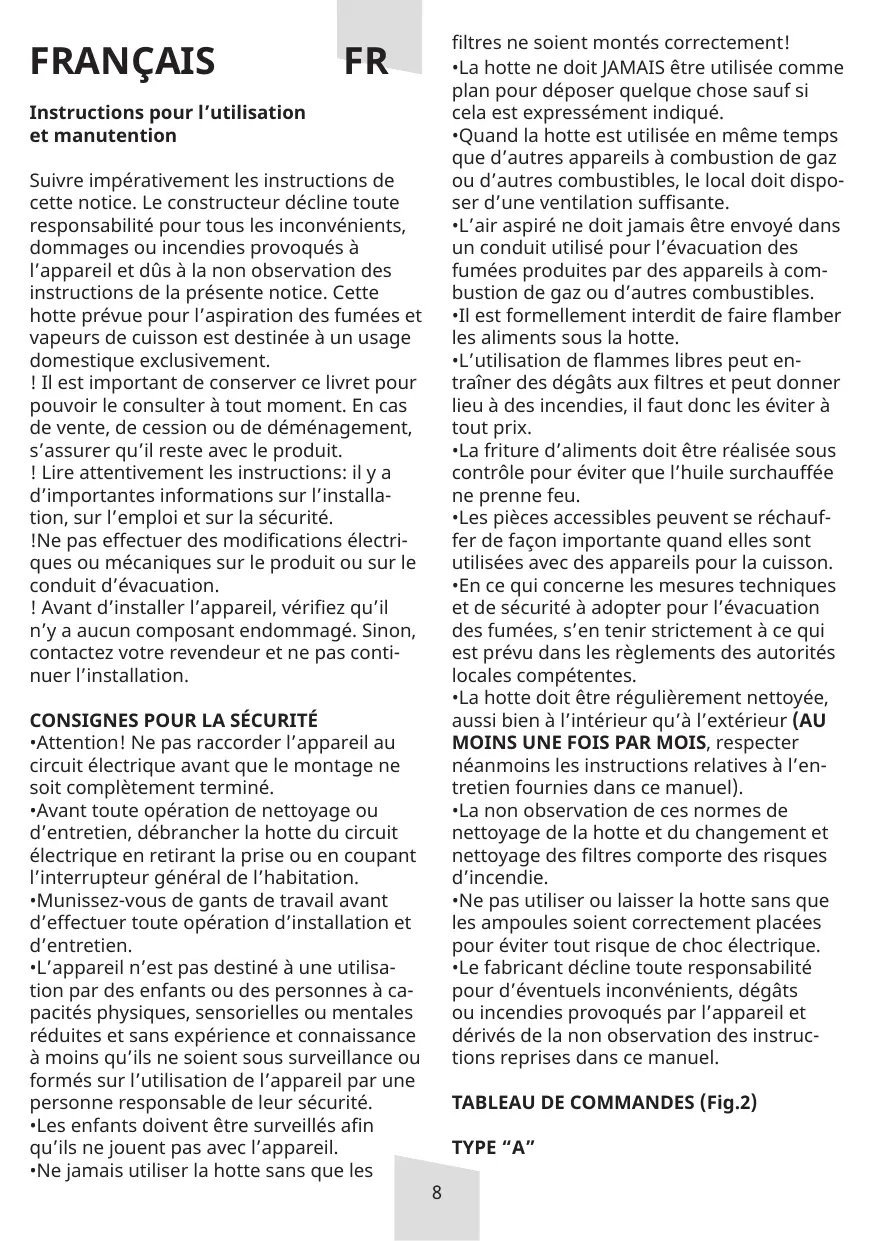 filtres ne soient montés correctement! •La hotte ne doit JAMAIS être utilisée comme plan pour déposer quelque chose sauf si cela est expressément indiqué. •Quand la hotte est utilisée en même temps que d’autres appareils à combustion de gaz ou d’autres combustibles, le local doit disposer d’une ventilation suffisante. •L’air aspiré ne doit jamais être envoyé dans un conduit utilisé pour l’évacuation des fumées produites par des appareils à combustion de gaz ou d’autres combustibles. •Il est formellement interdit de faire flamber les aliments sous la hotte. •L’utilisation de flammes libres peut entraîner des dégâts aux filtres et peut donner lieu à des incendies, il faut donc les éviter à tout prix. •La friture d’aliments doit être réalisée sous contrôle pour éviter que l’huile surchauffée ne prenne feu. •Les pièces accessibles peuvent se réchauffer de façon importante quand elles sont utilisées avec des appareils pour la cuisson. •En ce qui concerne les mesures techniques et de sécurité à adopter pour l’évacuation des fumées, s’en tenir strictement à ce qui est prévu dans les règlements des autorités locales compétentes. •La hotte doit être régulièrement nettoyée, aussi bien à l’intérieur qu’à l’extérieur (AU MOINS UNE FOIS PAR MOIS, respecter néanmoins les instructions relatives à l’entretien fournies dans ce manuel). •La non observation de ces normes de nettoyage de la hotte et du changement et nettoyage des filtres comporte des risques d’incendie. •Ne pas utiliser ou laisser la hotte sans que les ampoules soient correctement placées pour éviter tout risque de choc électrique. •Le fabricant décline toute responsabilité pour d’éventuels inconvénients, dégâts ou incendies provoqués par l’appareil et dérivés de la non observation des instructions reprises dans ce manuel.